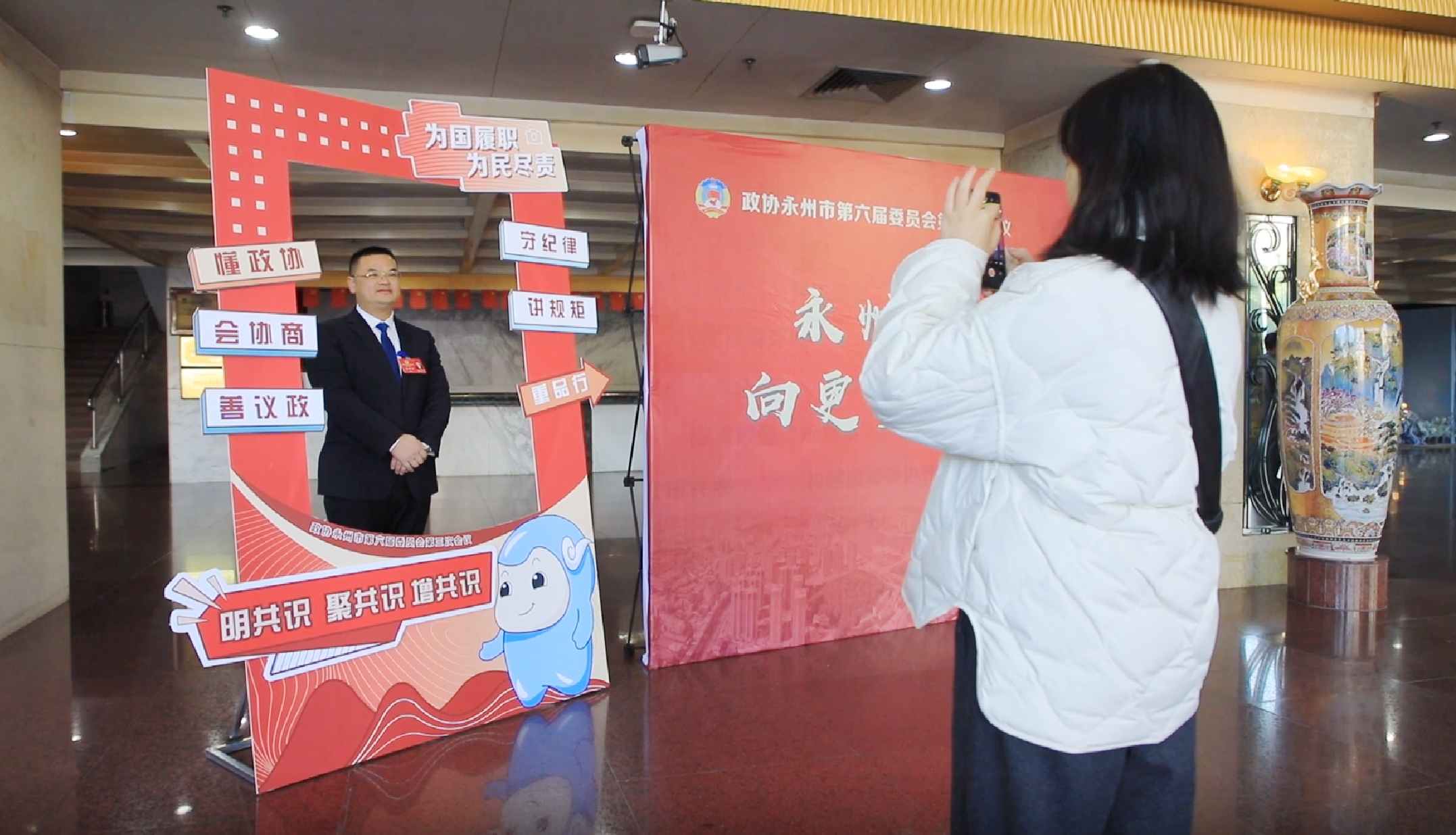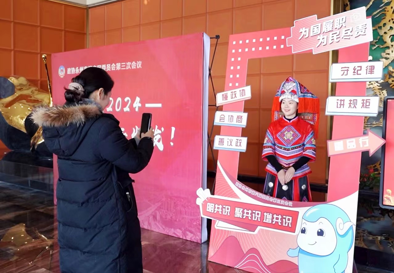 今年,为了让政协委员们有更好的履职体验,各驻地还设置了“留影框”,完成报到程序后的委员们纷纷在此打卡拍照。