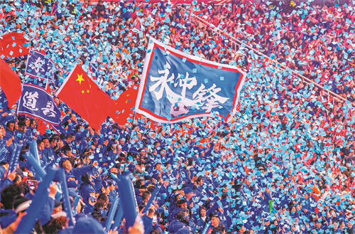 12月20日晚,湘超永州队球迷在长沙贺龙体育场“蓝色海洋”中为永州队进球而欢呼庆祝。 永州日报全媒体记者 文佳星 摄