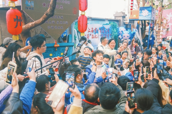 2026年1月17日,永州市体育场,“湘超”永州队球员高响在“挂票”区与游客交流... -