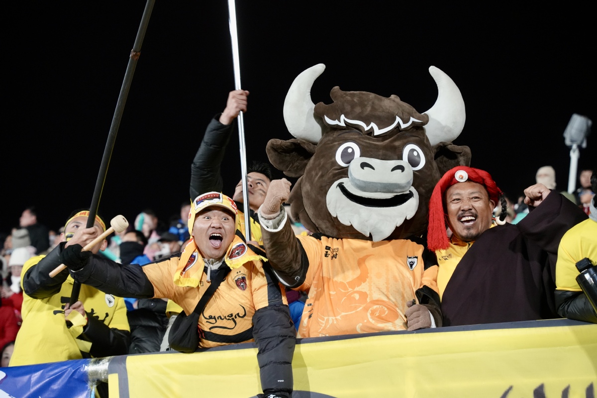 1月20日,在永州举办的“央超”比赛中,青海玉树队球迷在现场为球队加油助威。