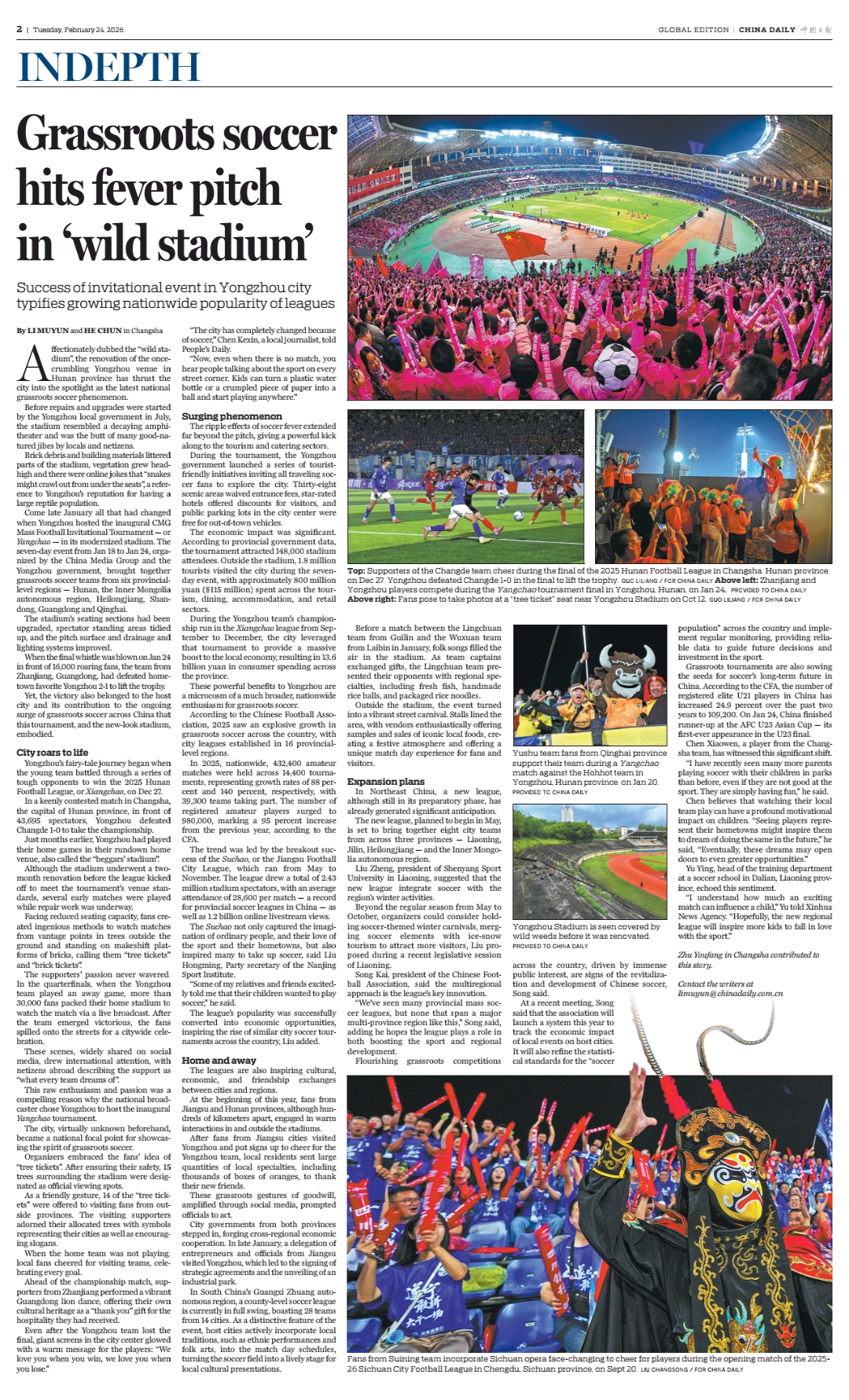 从“野生球场”的戏谑自嘲,到“挂票”“砖票”的火热出圈,再到承办首届“央超”比赛、六省区球迷共襄盛举,湖南永州这座湘南小城因足球而彻底蝶变,成为席卷全国的群众足球热潮的缩影。2月24日,中国日报2版刊发整版深度报道《Grassroots soccer hits fever pitch in 'wild stadium'(“野生球场”变身记:群众足球点燃城市激情)》,讲述永州将老旧体育场改造为全国草根足球新地标的故事,展现中国群众足球热潮如何激发城市活力、带动文旅消费,成为乡村振兴与城市转型的生动注脚。