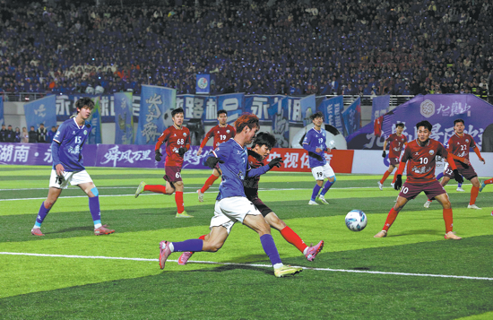 12月27日,2025湖南省足球联赛(“湘超”)在长沙贺龙体育场上演巅峰对决,最终永州队以1∶0战胜常德队夺冠。 郭立亮/摄
