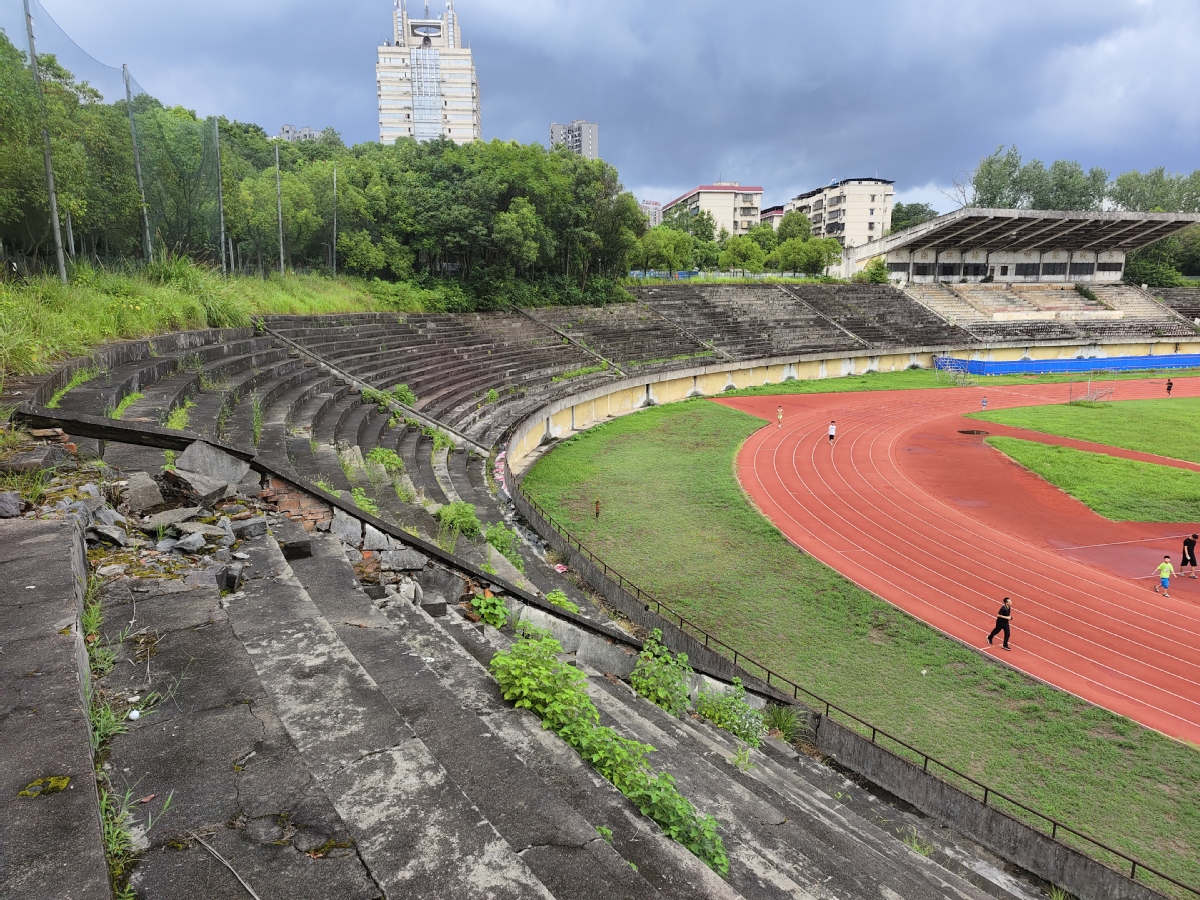 修缮之前的永州体育场,看台上杂草丛生。