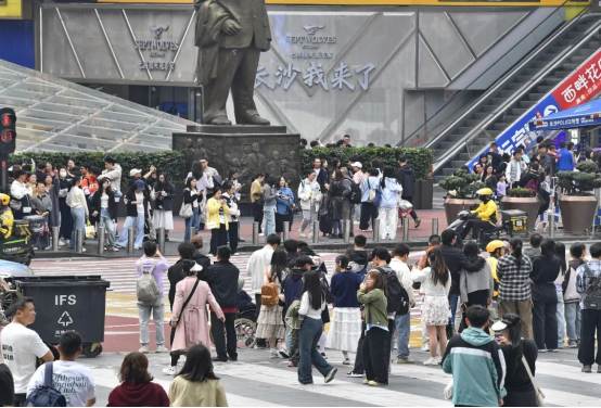 长沙市五一商圈,不少游客趁着晴好天气来此打卡游玩