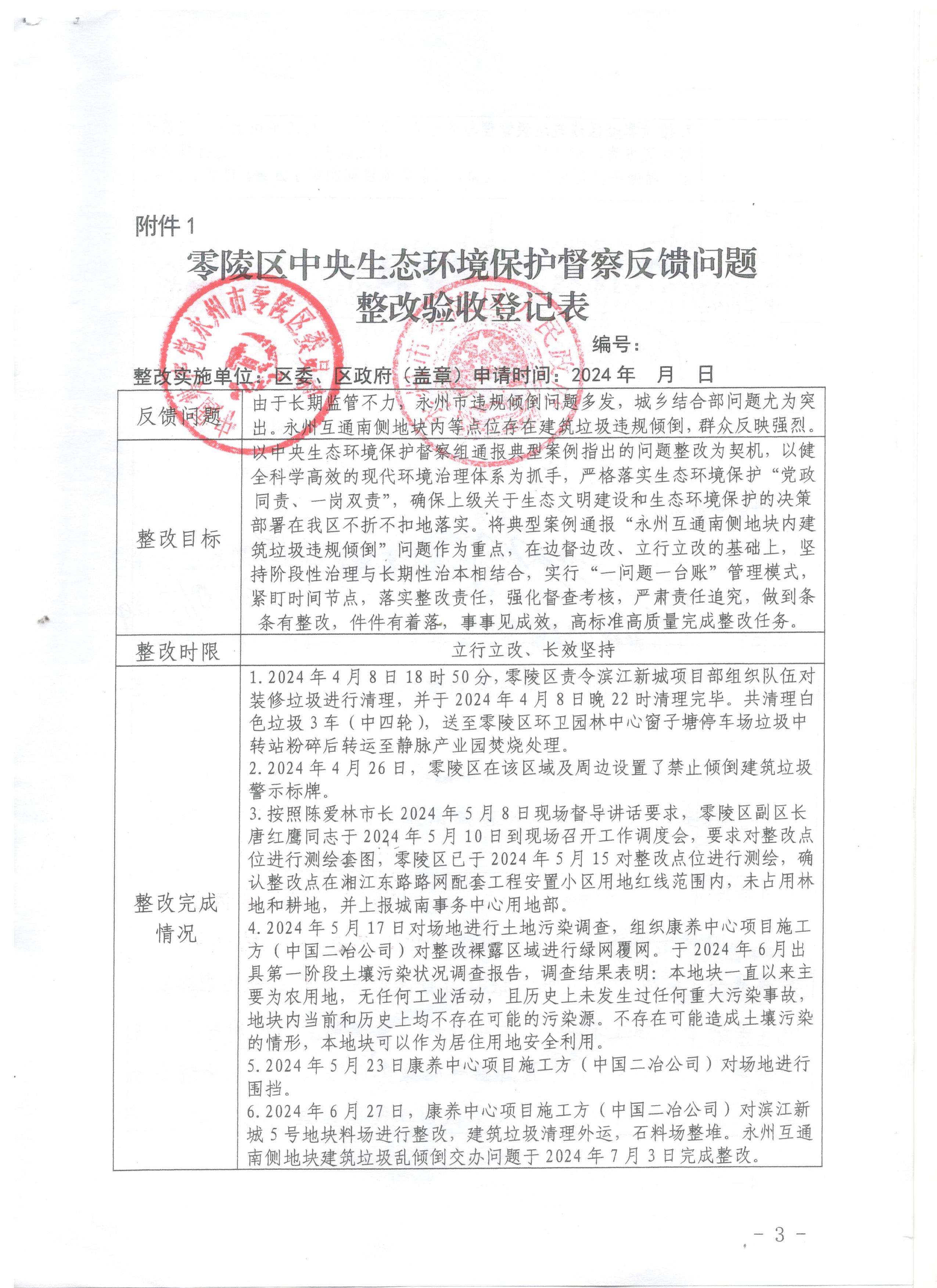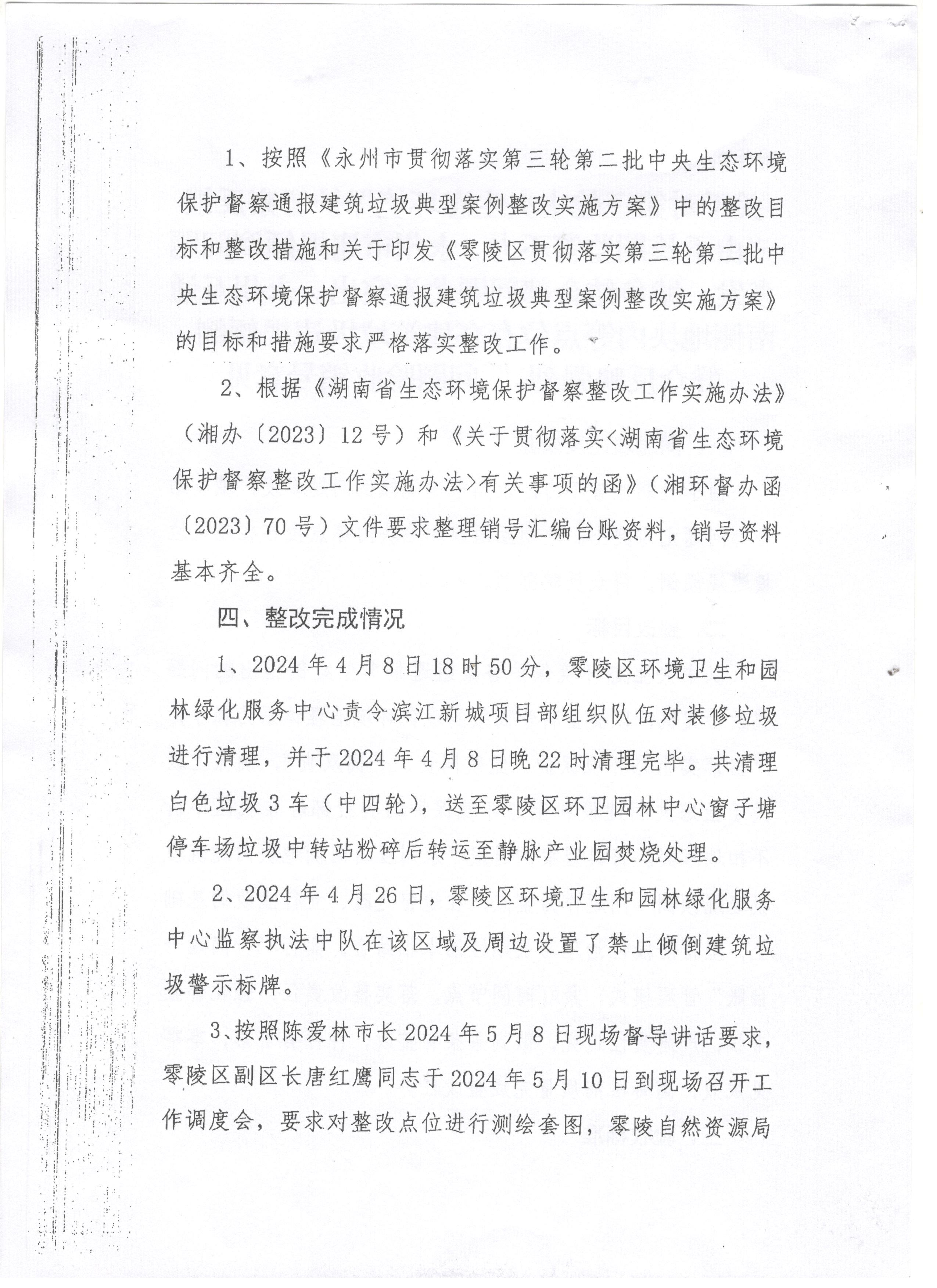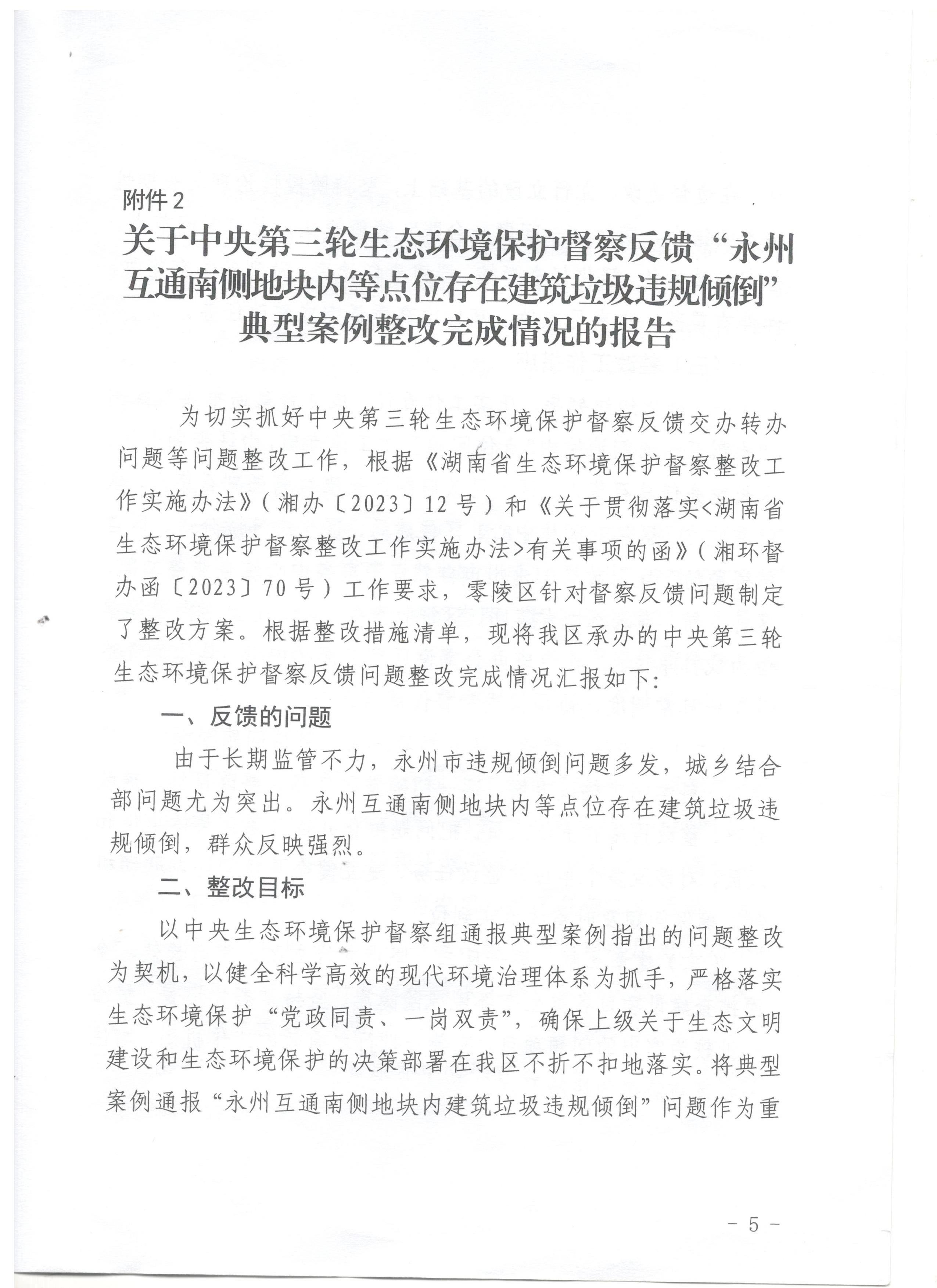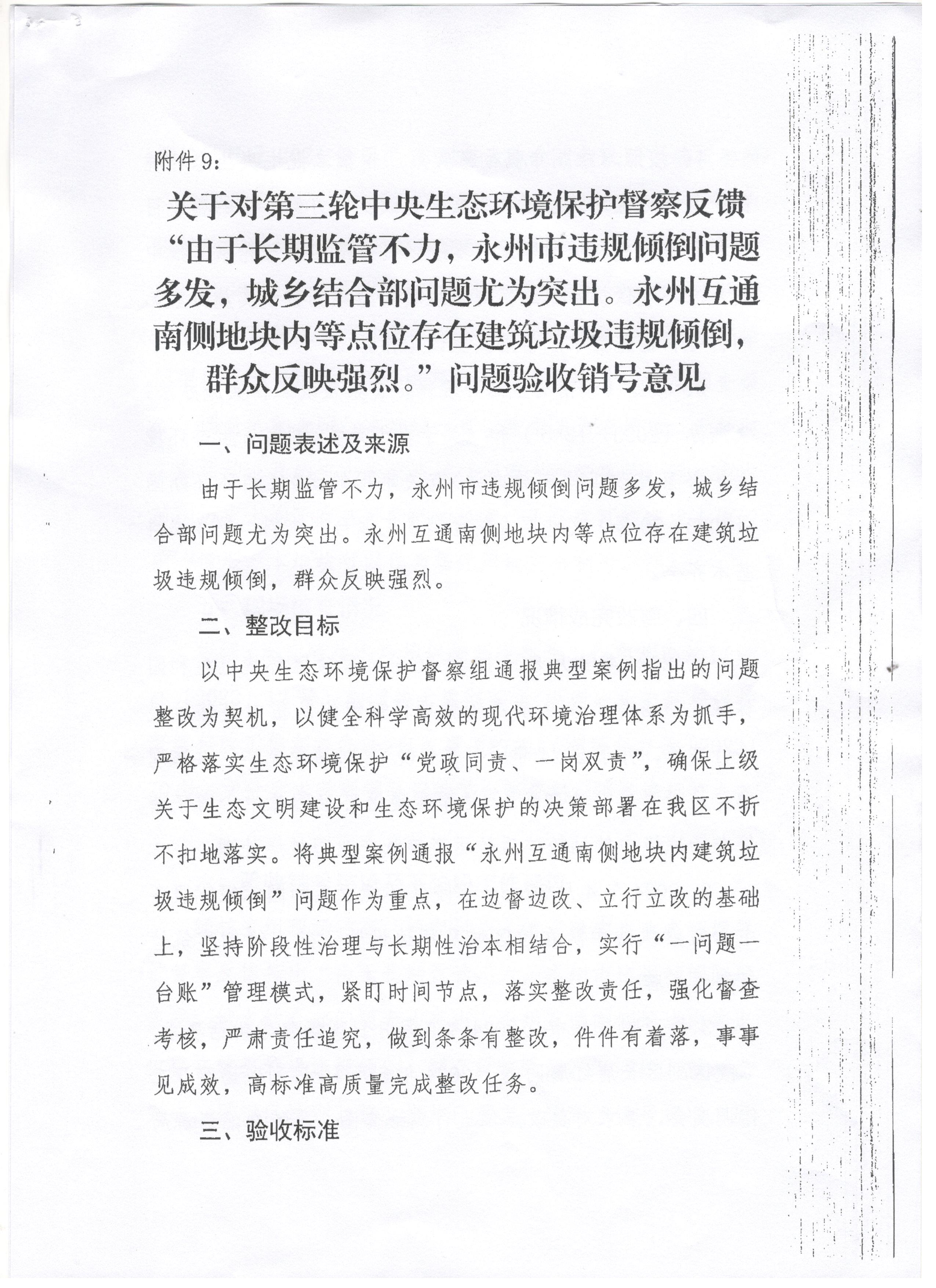 关于中央第三轮生态环境保护督察反馈“永州互通南侧地块内等单位存在建筑垃圾违规倾倒”典型案例整改销号的请示