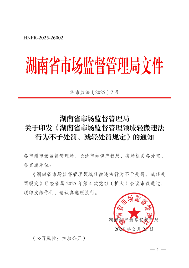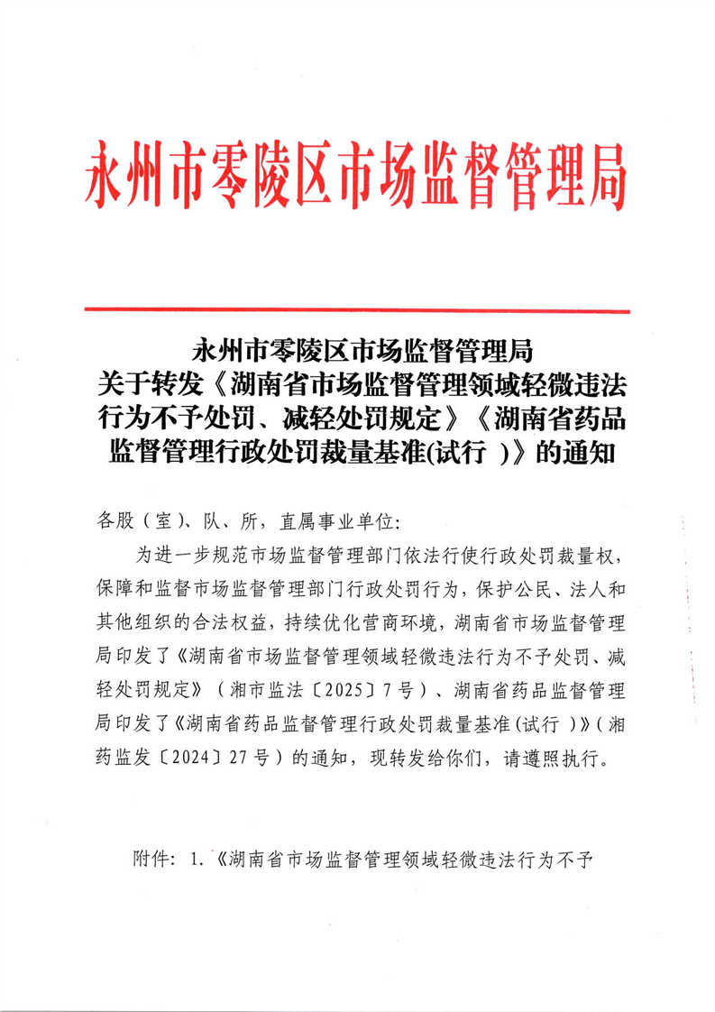 关于转发《湖南省市场监督管理领域轻微违法行为不予处罚、减轻处罚规定》《湖南省药品监督管理行政处罚裁量基准(试行)》的通知