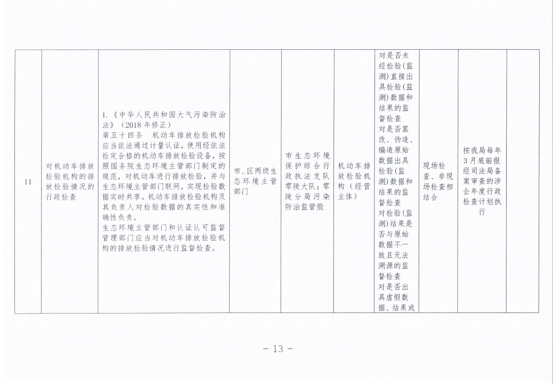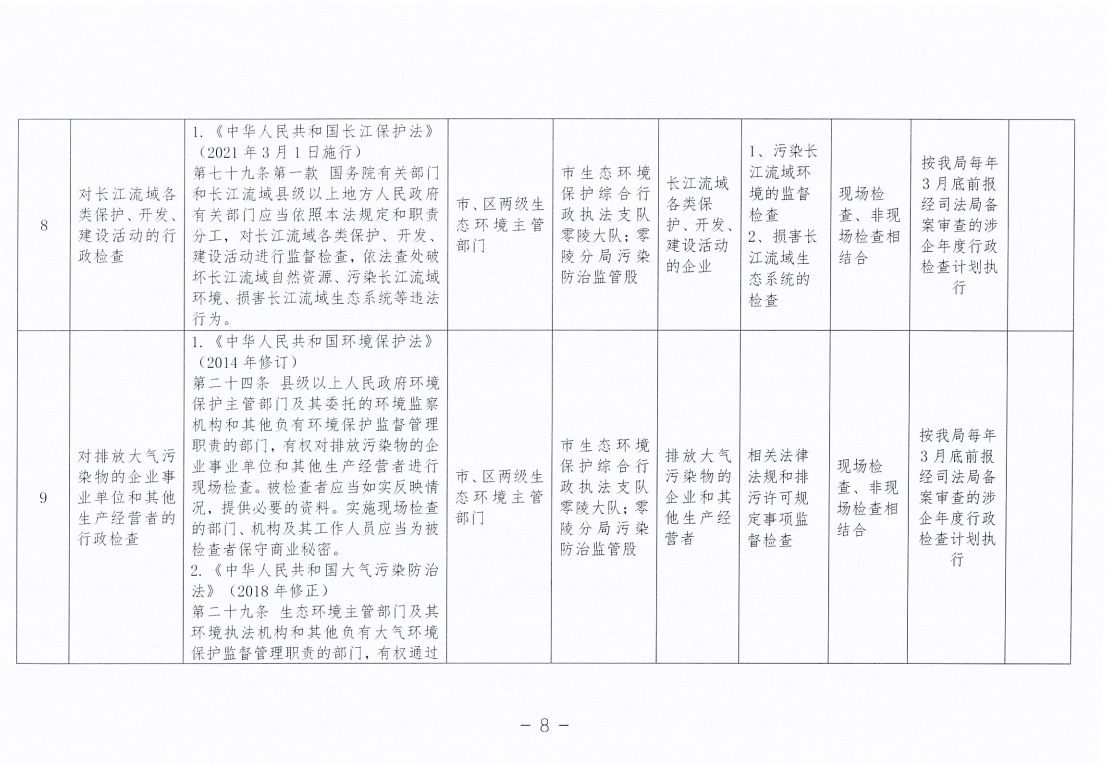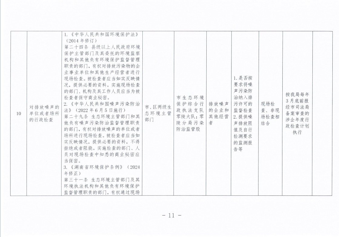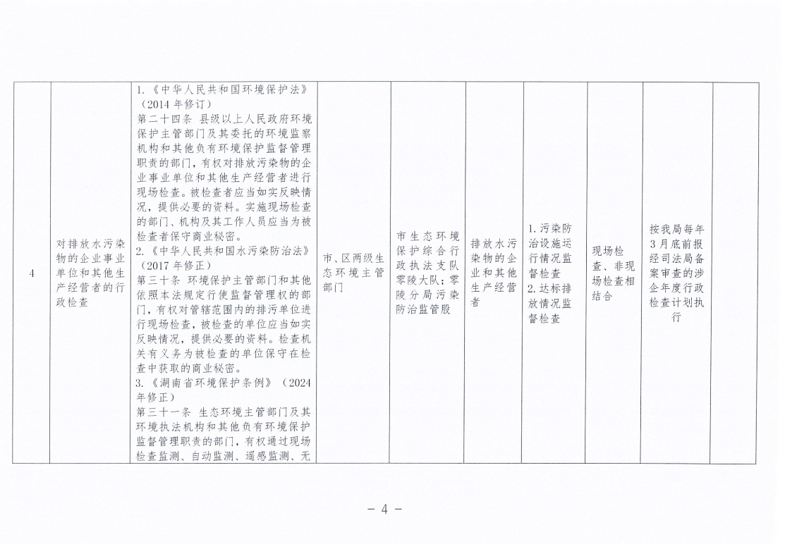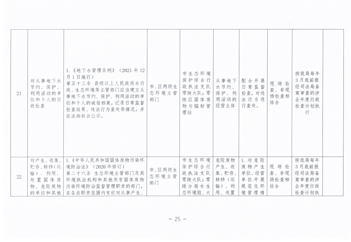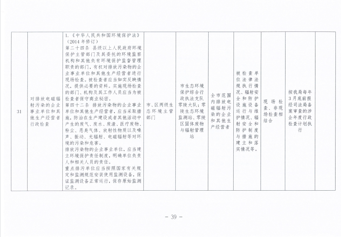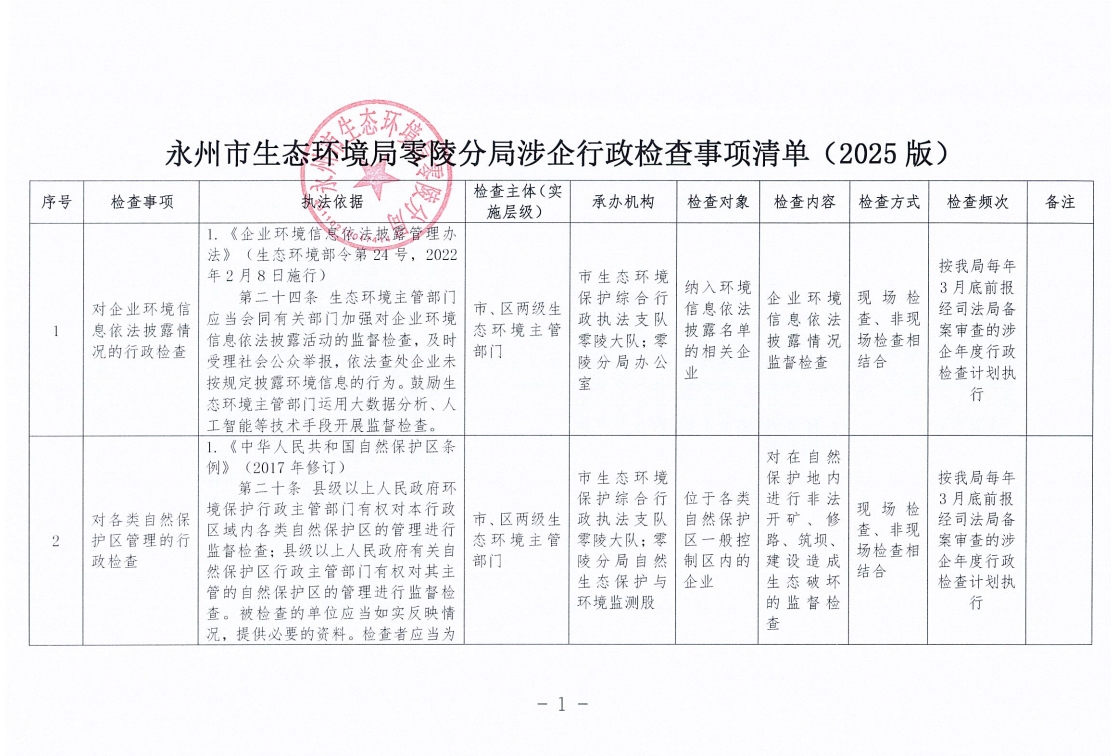永州市生态环境局零陵分局涉企行政检查事项清单