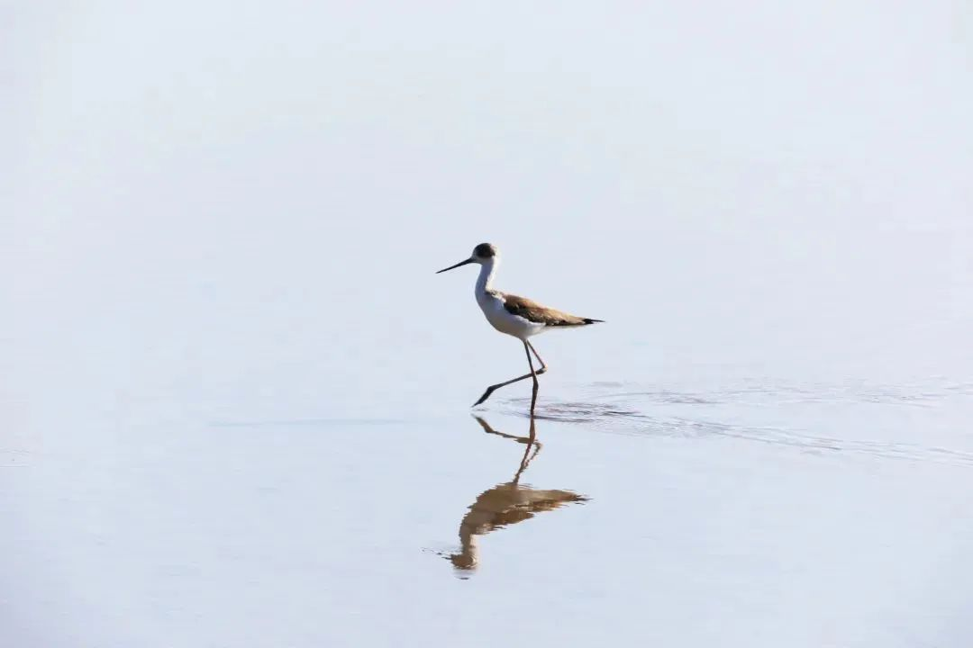 2021年9月,成群黑颈长脚鹬在湿地觅食、嬉戏。