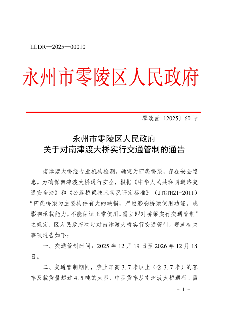 永州市零陵区人民政府关于对南津渡大桥实行交通管制的通告