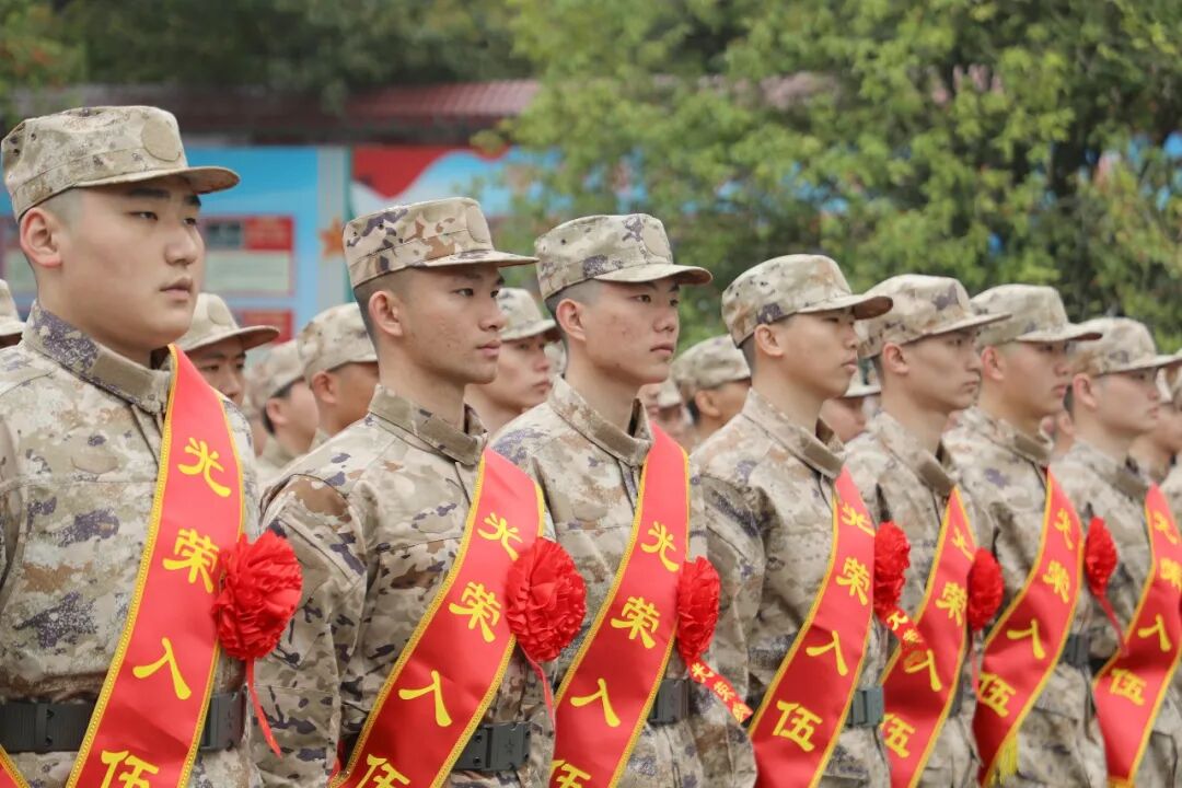 105名潇湘儿郎肩披绶带、胸戴红花,军容严整、英姿勃发。区委常委、区人武部部长蒋崇文宣读入伍命令,区领导为新兵及家长代表佩戴红花、发放“光荣牌”。随后,全体新兵面向军旗庄严宣誓,表达投身国防、报效祖国的坚定决心。