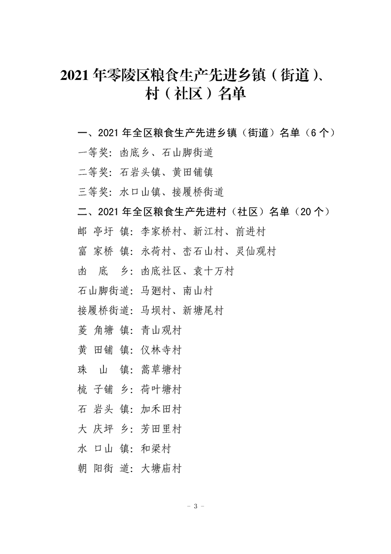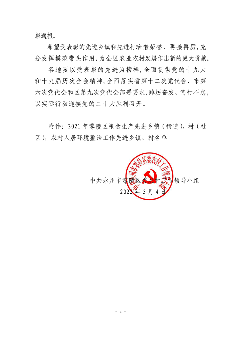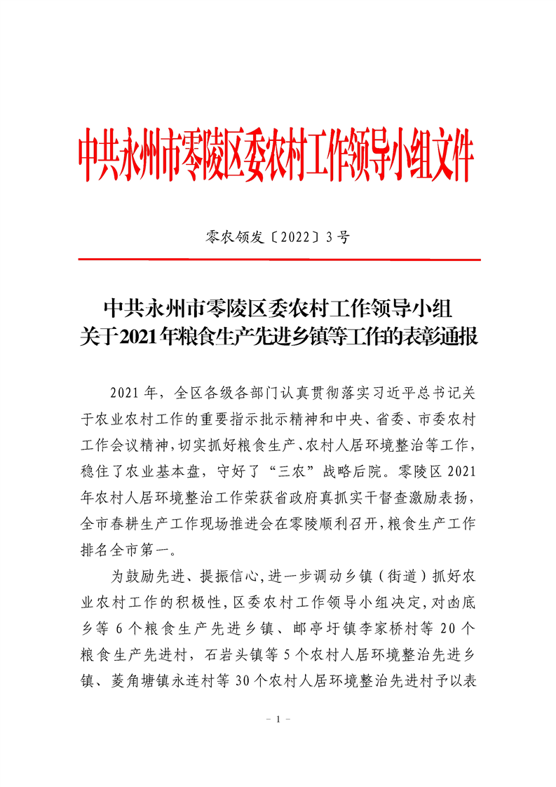 中共永州市零陵区委农村工作领导小组关于2021年粮食生产先进乡镇等工作的表彰通报