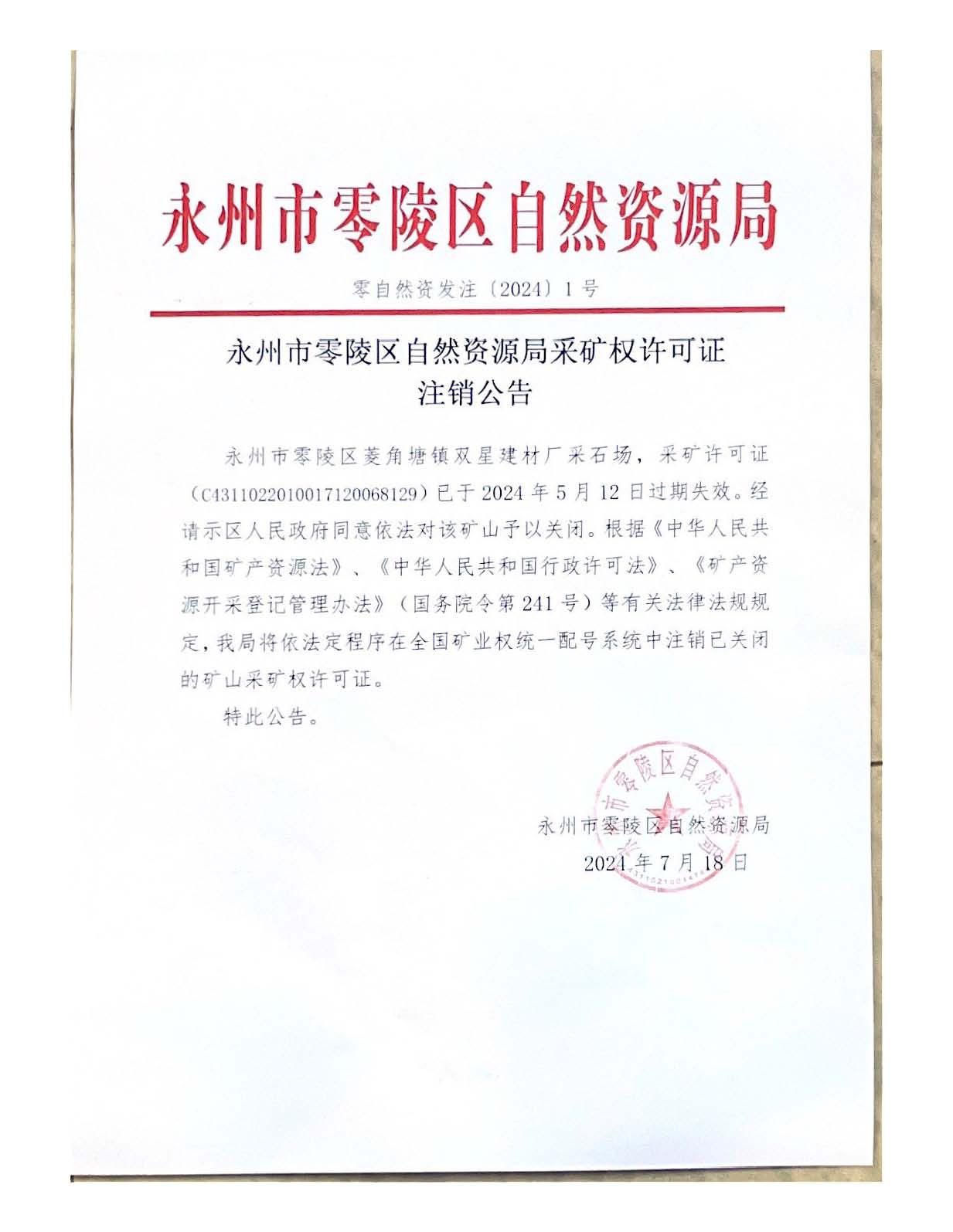 关于零陵区菱角塘镇双星建材厂采石场采矿权许可证注销的公告