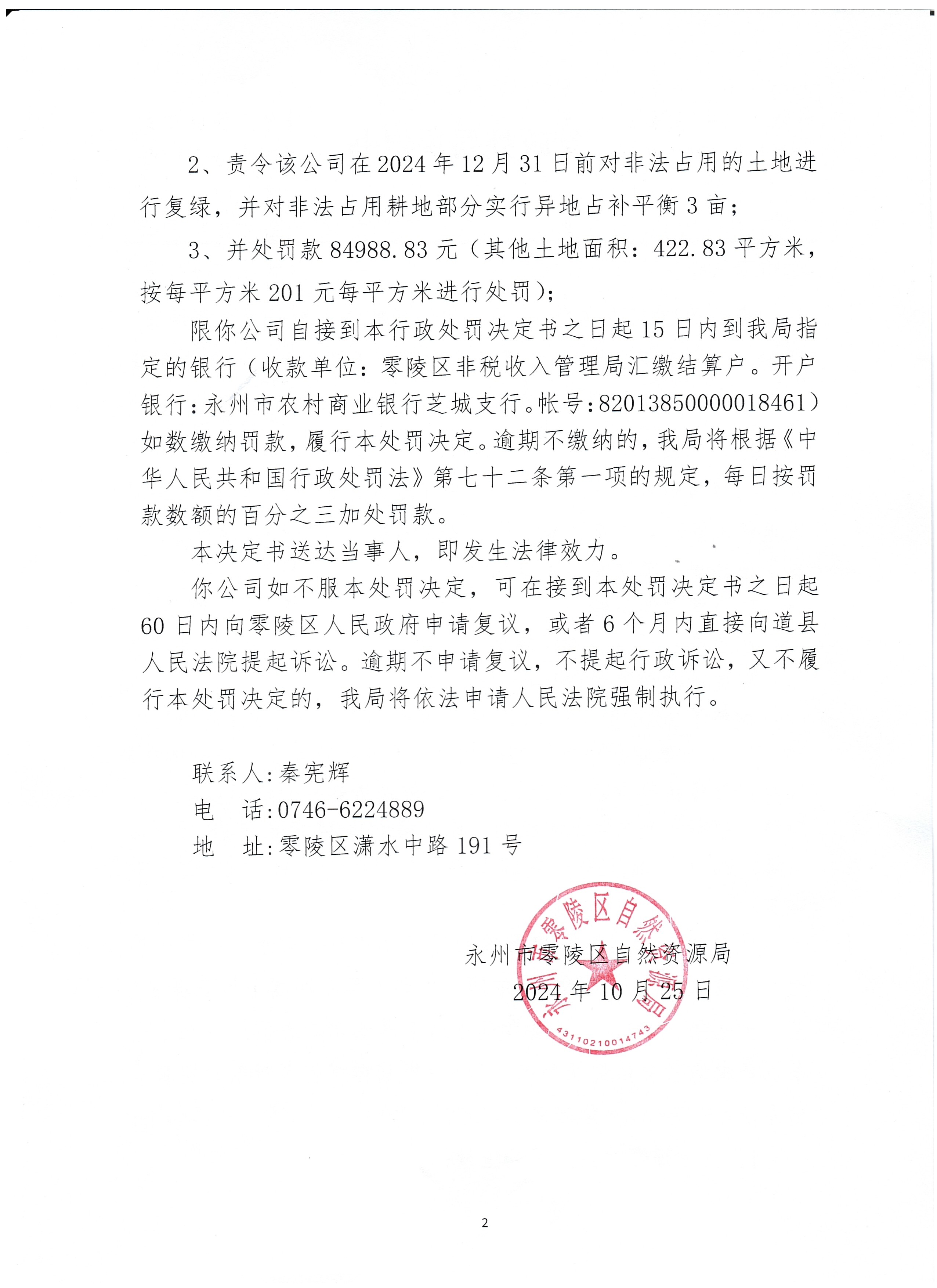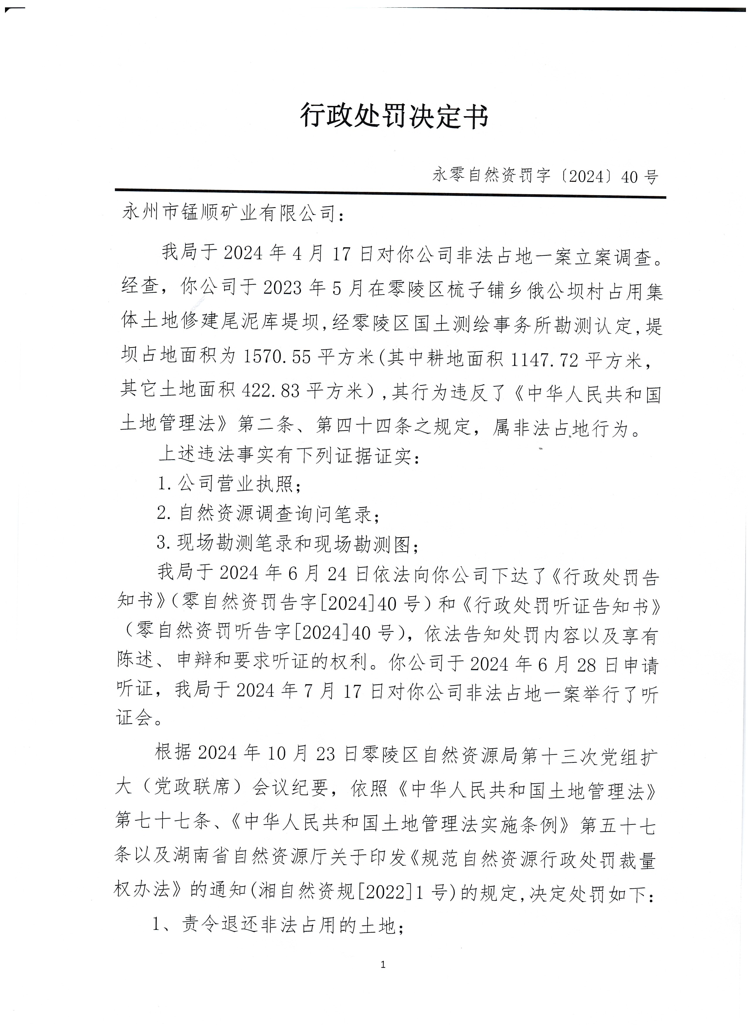 行政处罚决定书(永州市锰顺矿业有限公司)永零自然资罚字〔2024〕40号