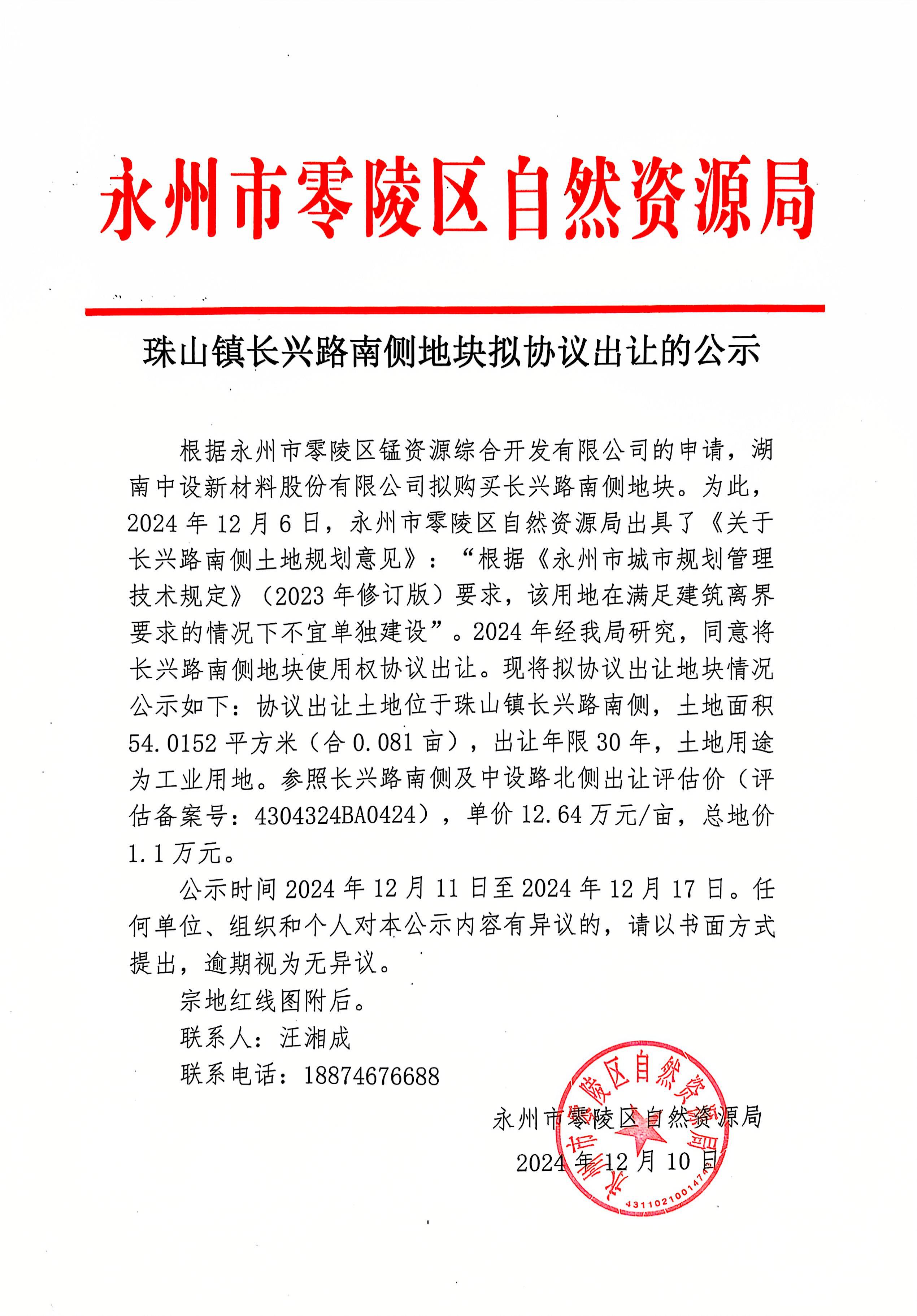关于珠山镇长兴路南侧地块拟协议出让的公示