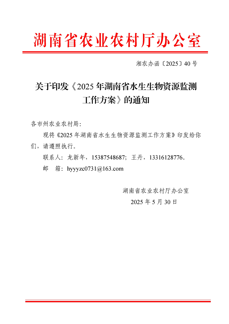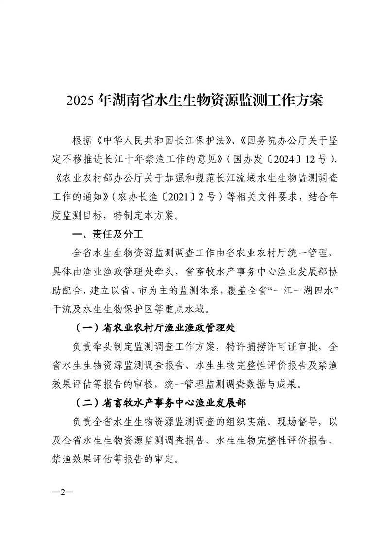 转发湖南省农业农村厅关于印发《2025年湖南省水生生物资源监测工作方案》的通知