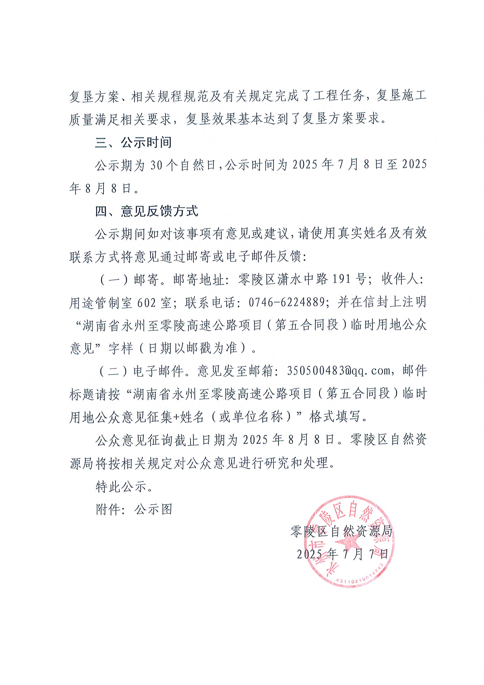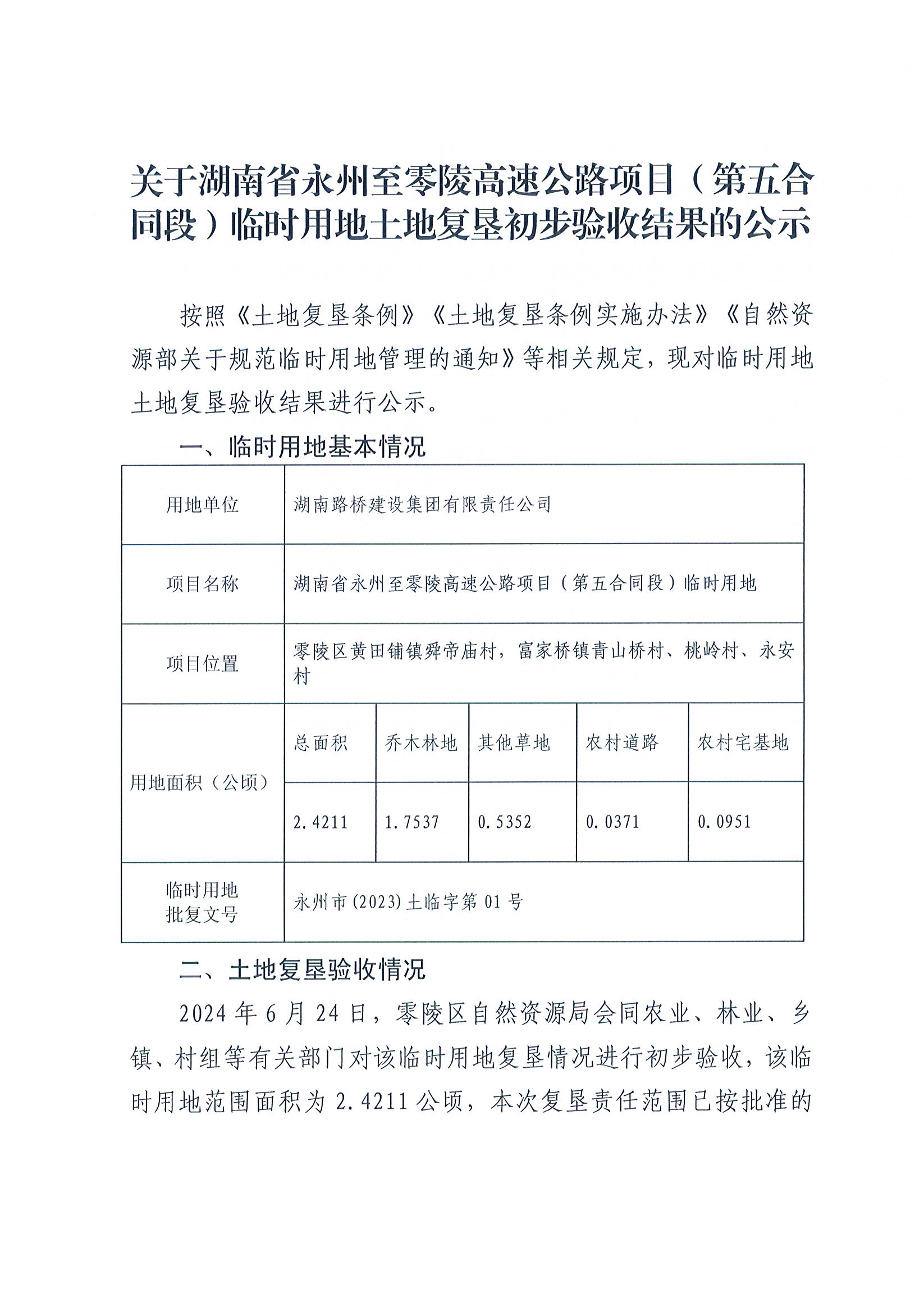 关于湖南省永州至零陵高速公路项目(第五合同段)临时用地土地复垦初步验收结果的公示