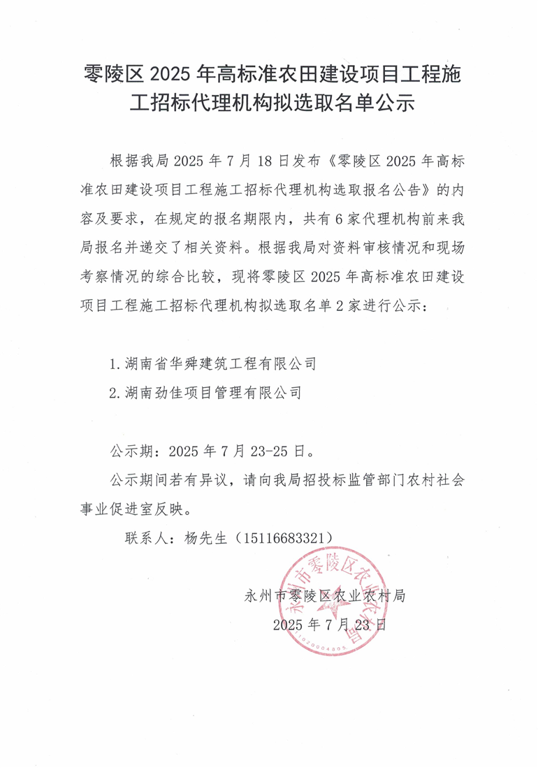 零陵区 2025 年高标准农田建设项目工程施工招标代理机构拟选取名单公示