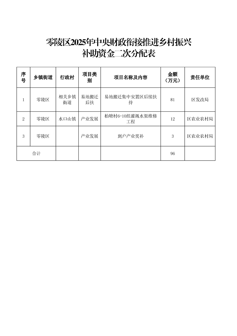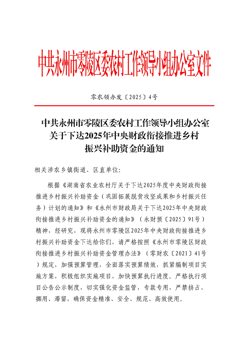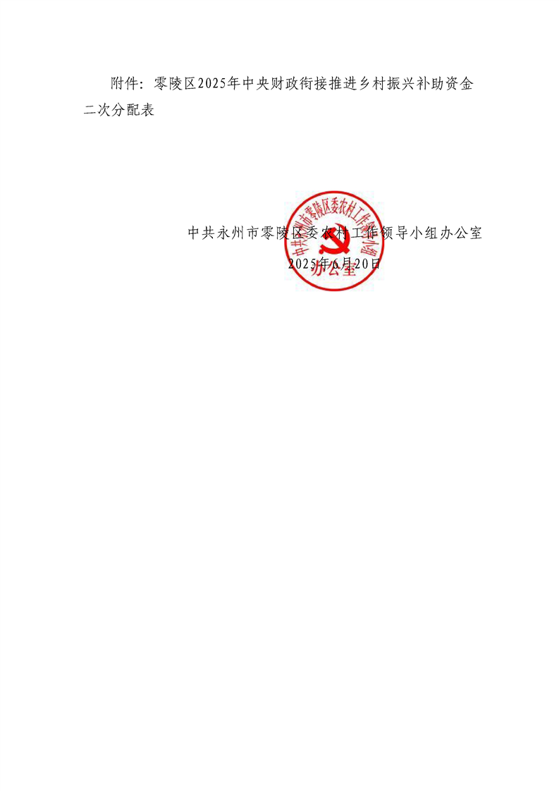 中共永州市零陵区委农村工作领导小组办公室关于下达2025年中央财政衔接推进乡村振兴补助资金的通知