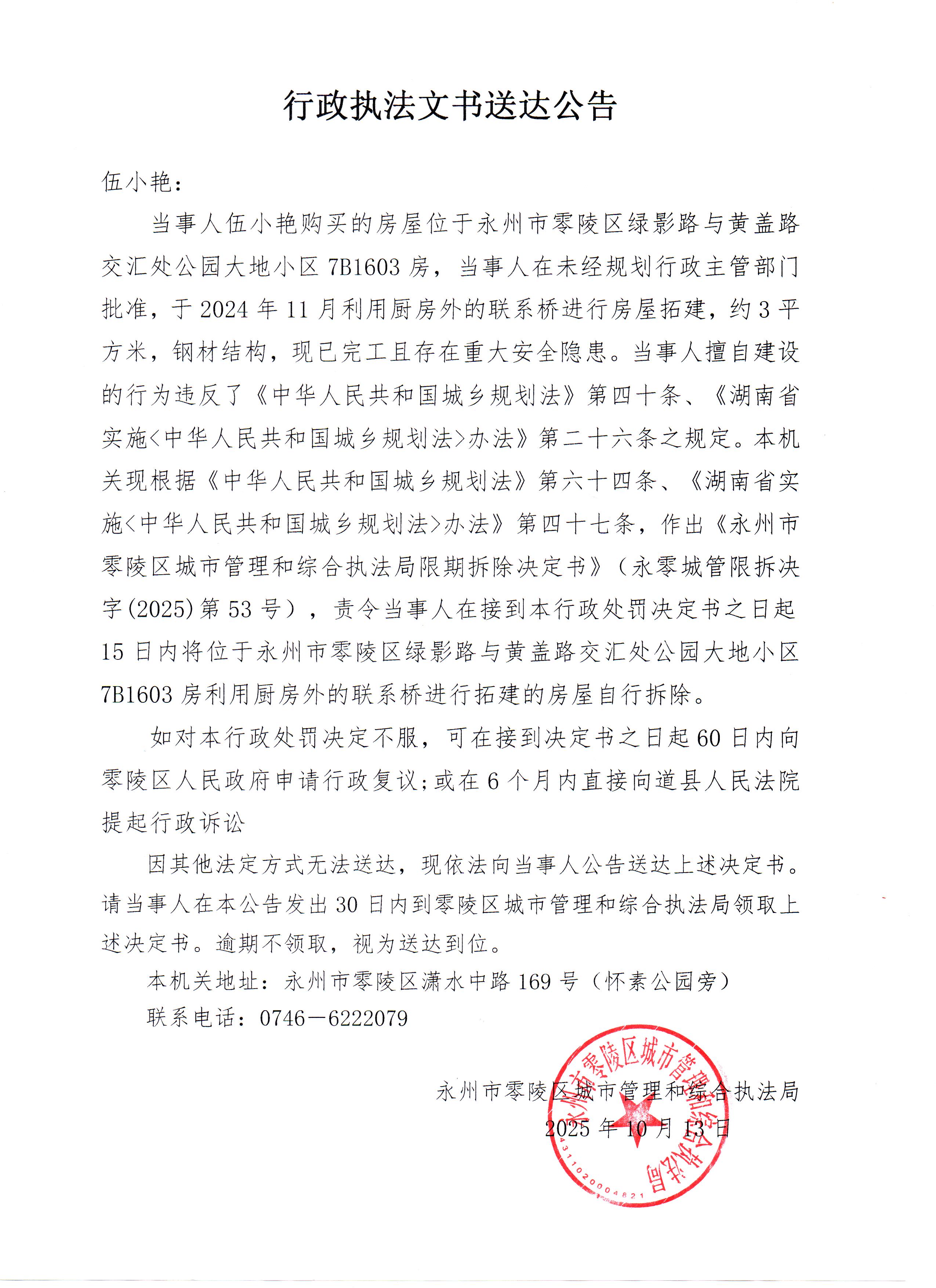 行政执法文书送达公告(伍小艳)