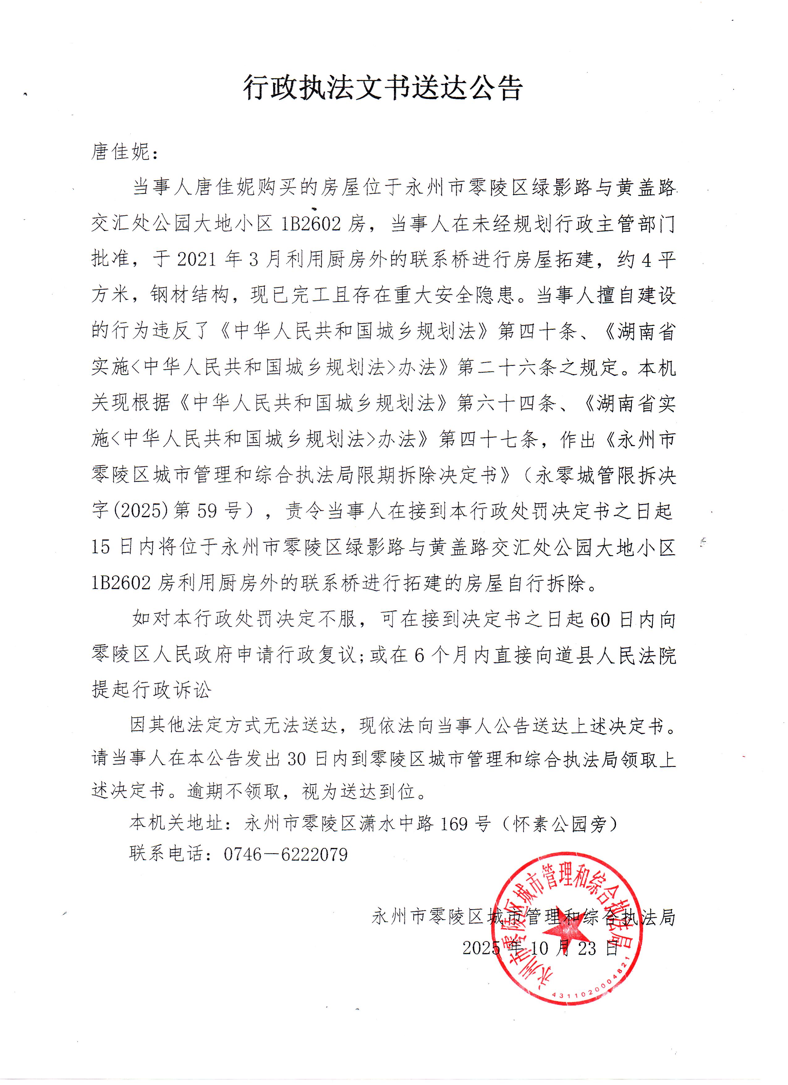 行政执法文书送达公告(唐佳妮)