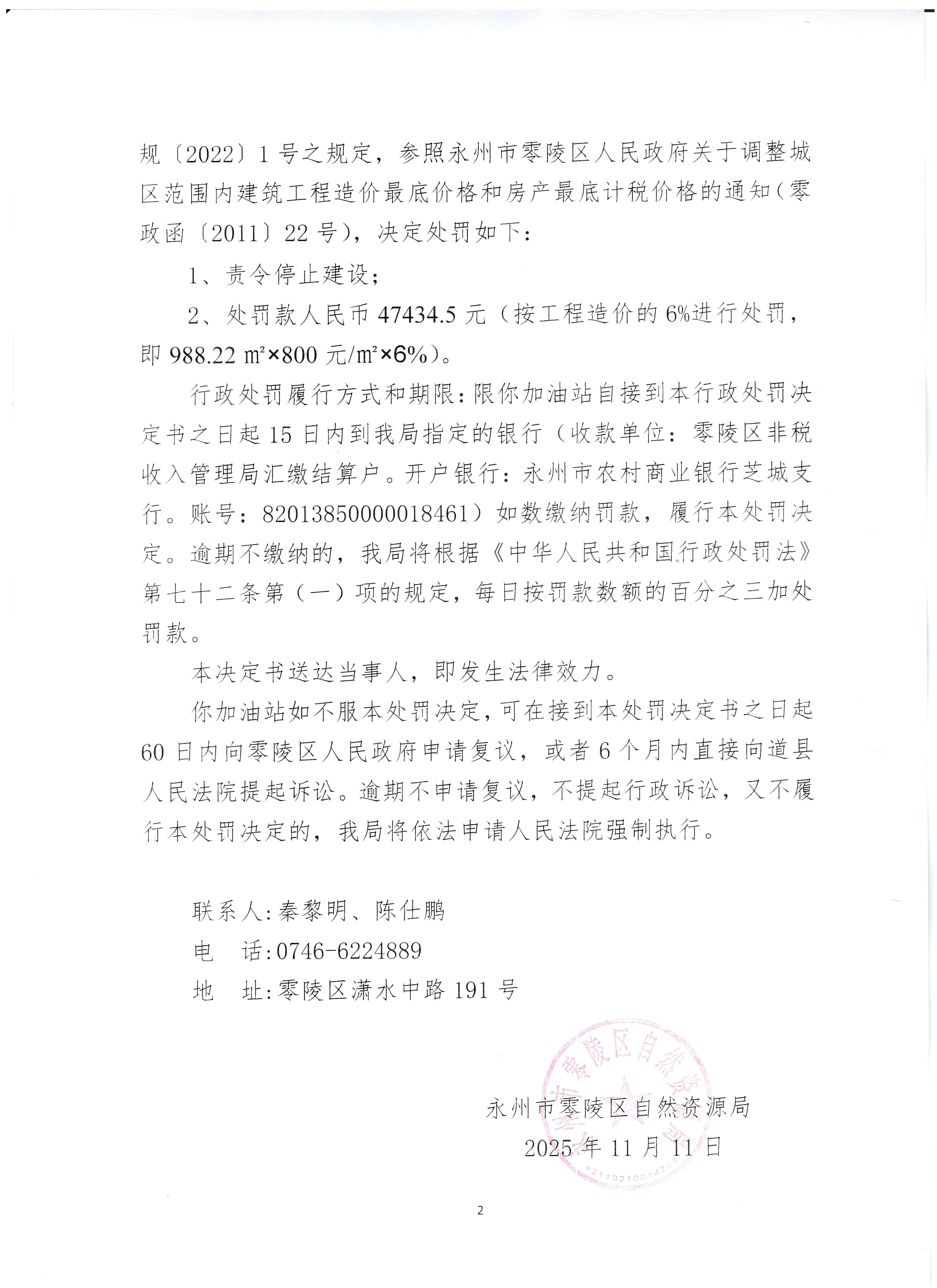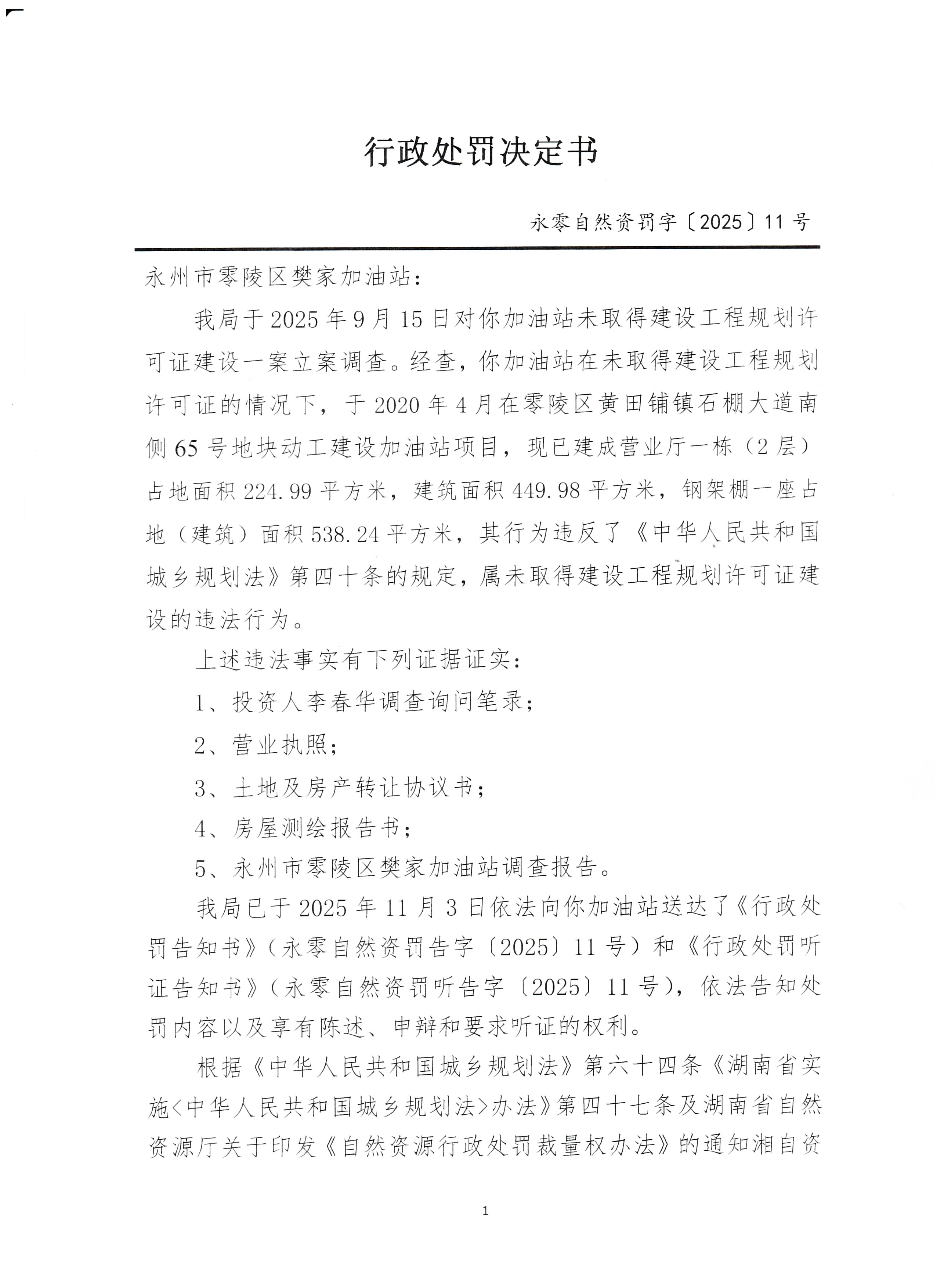 行政处罚决定书(永州市零陵区樊家加油站)永零自然资罚字〔2025〕11 号