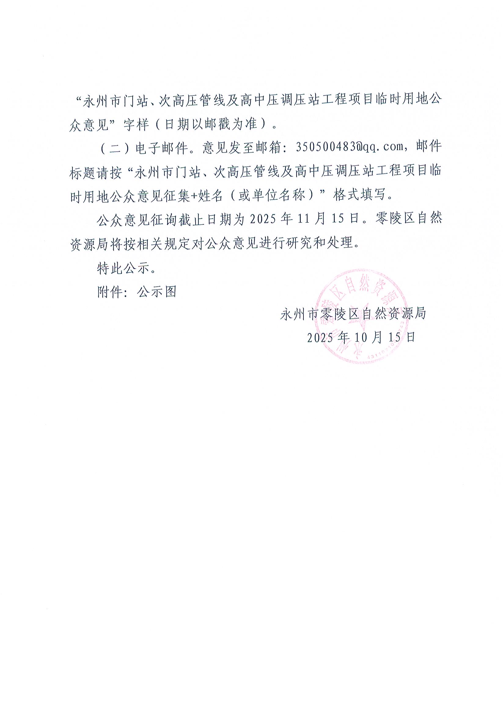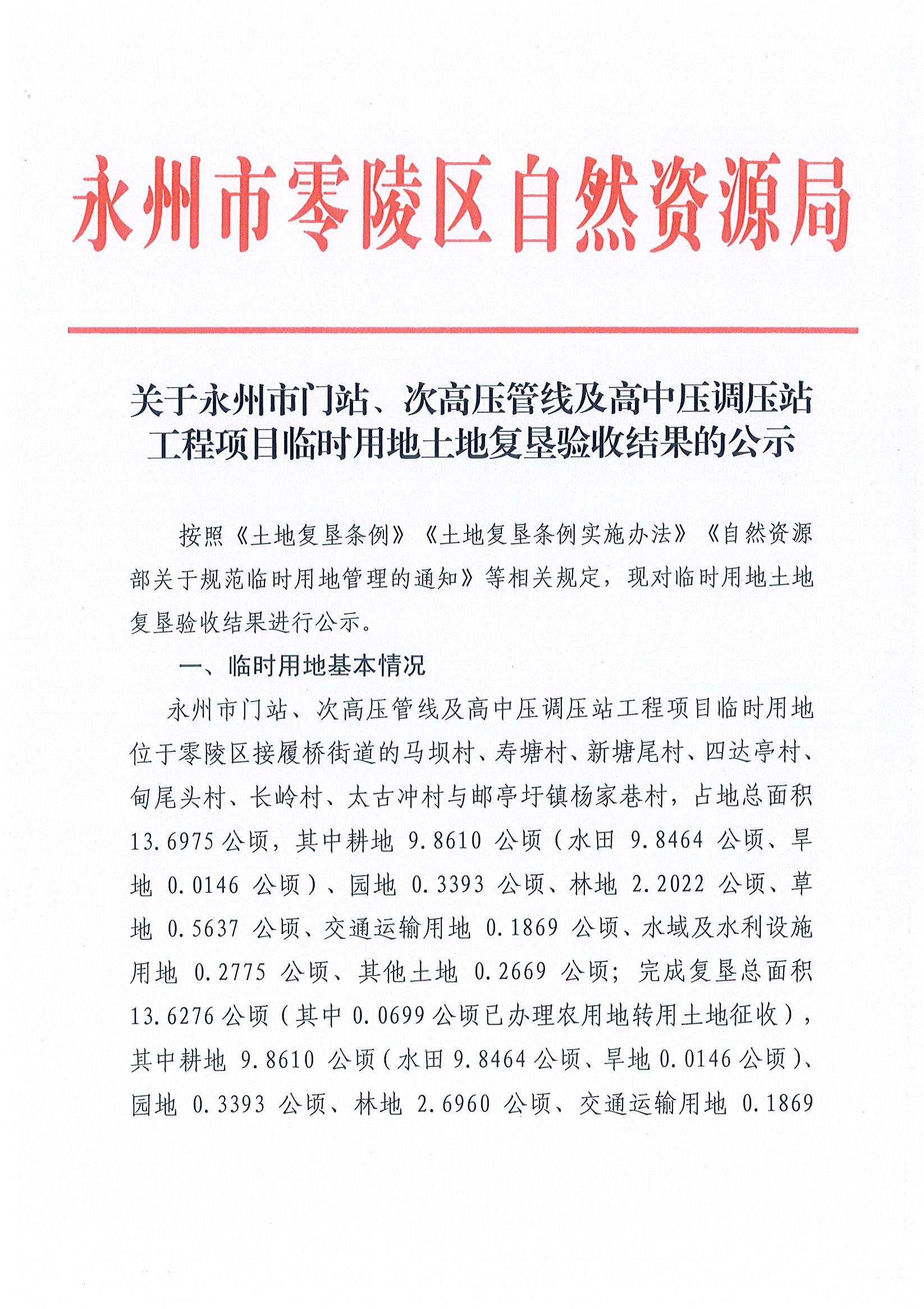 关于永州市门站、次高压管线及高中压调压站工程项目临时用地土地复垦验收结果的公示