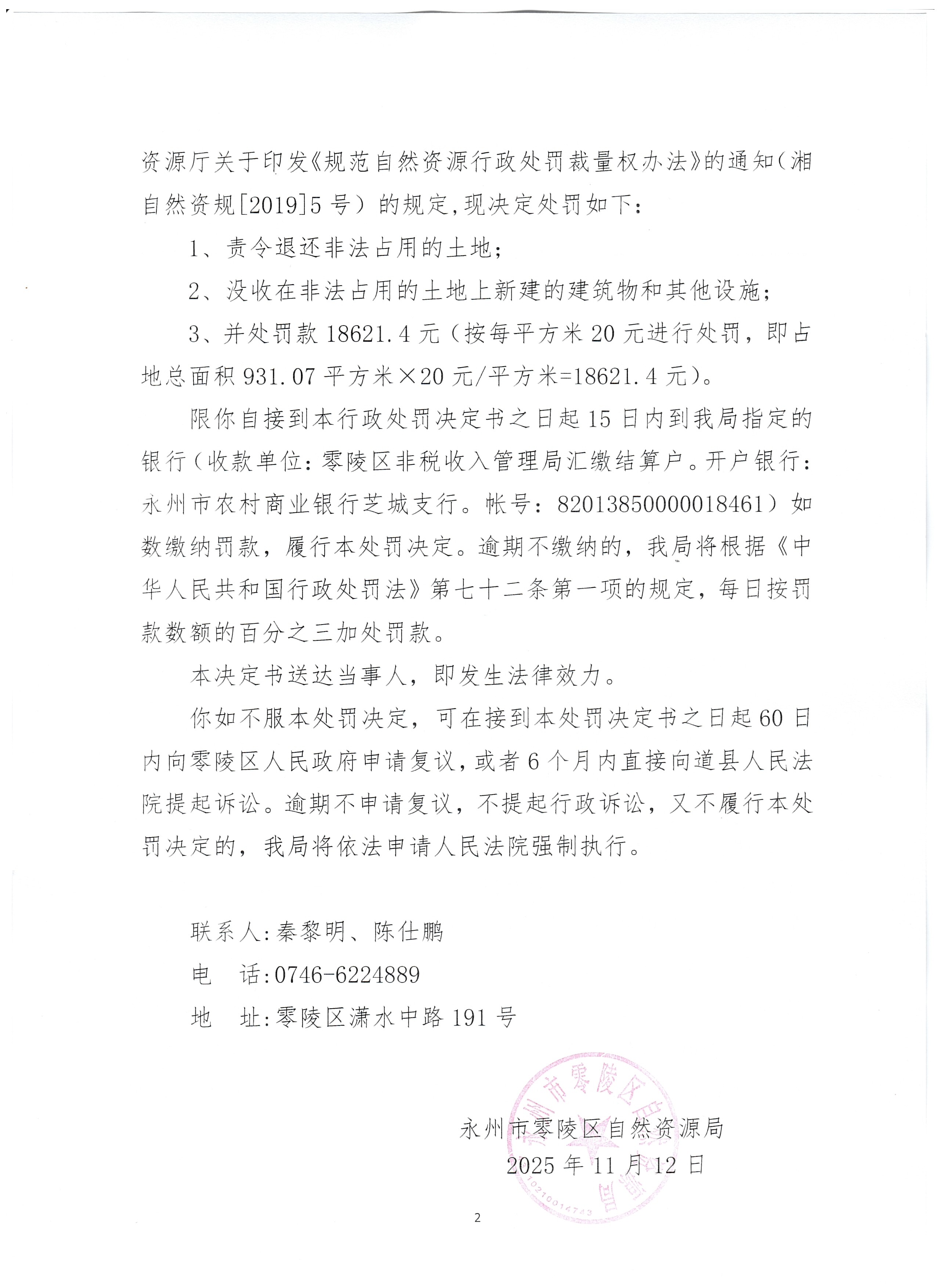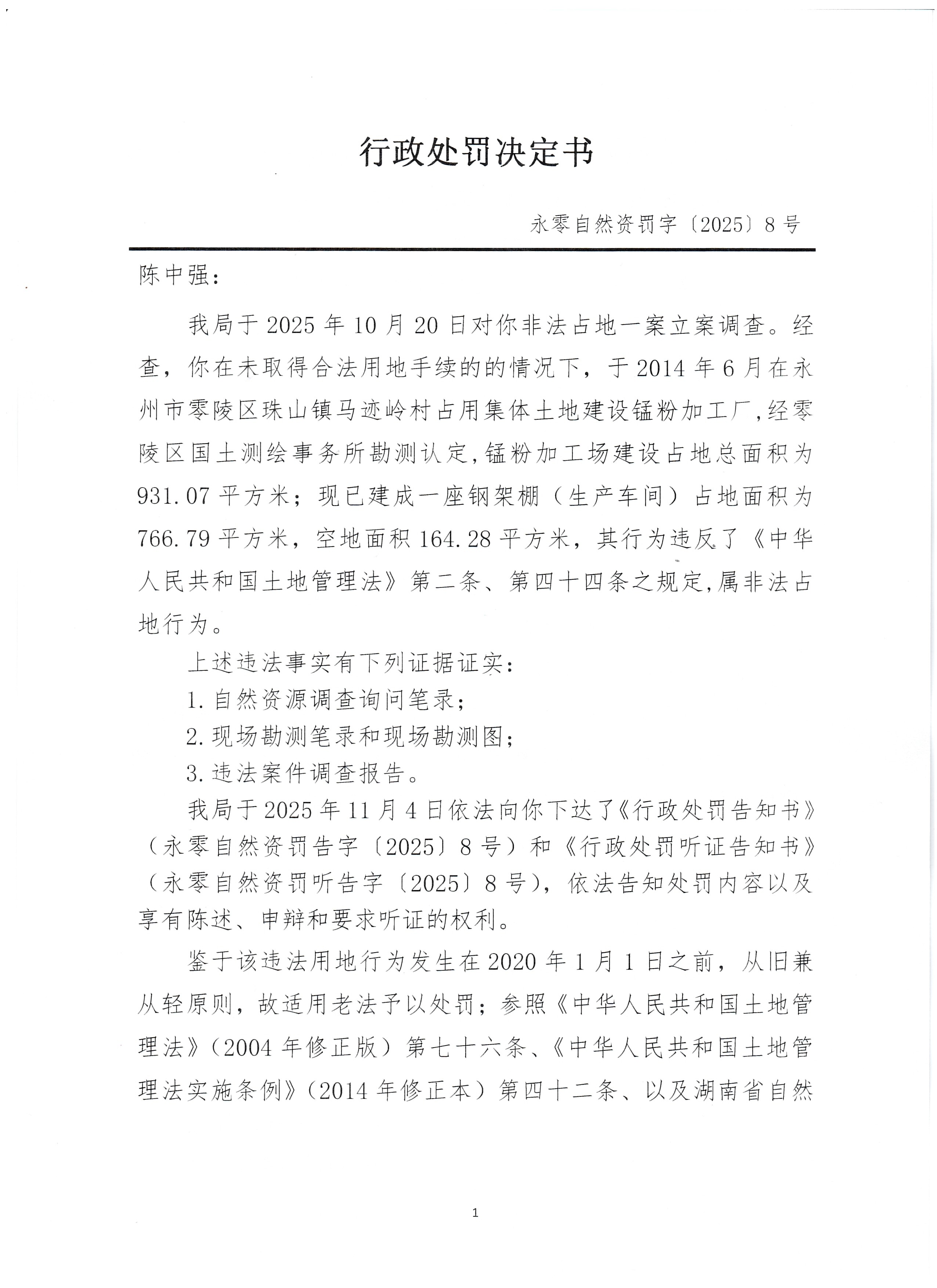 行政处罚决定书(陈中强)永零自然资罚字〔2025〕8 号