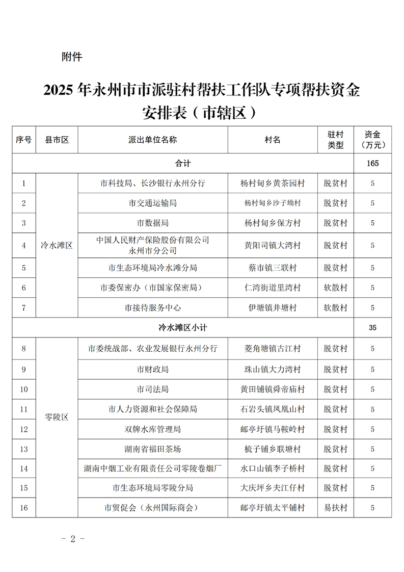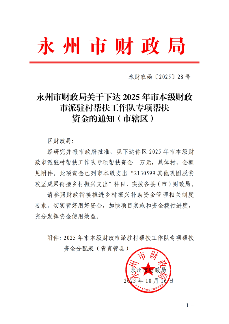 永州市财政局关于下达2025年市本级财政市派驻村帮扶工作队专项帮扶资金的通知(市辖区)