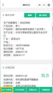 在产品档案,点“编辑”菜单,进入档案记录模块,记录各环节农事活动信息。农事记录为可选项。生产主体可上传检测报告等质量合格凭证。政府抽检合格数据、基地巡检数据将自动关联至该产品档案。
