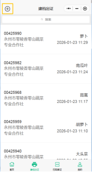 3.产品建档:生产主体使用“建档出证”菜单,点按左上角“+”号,建立所供产品档案。
