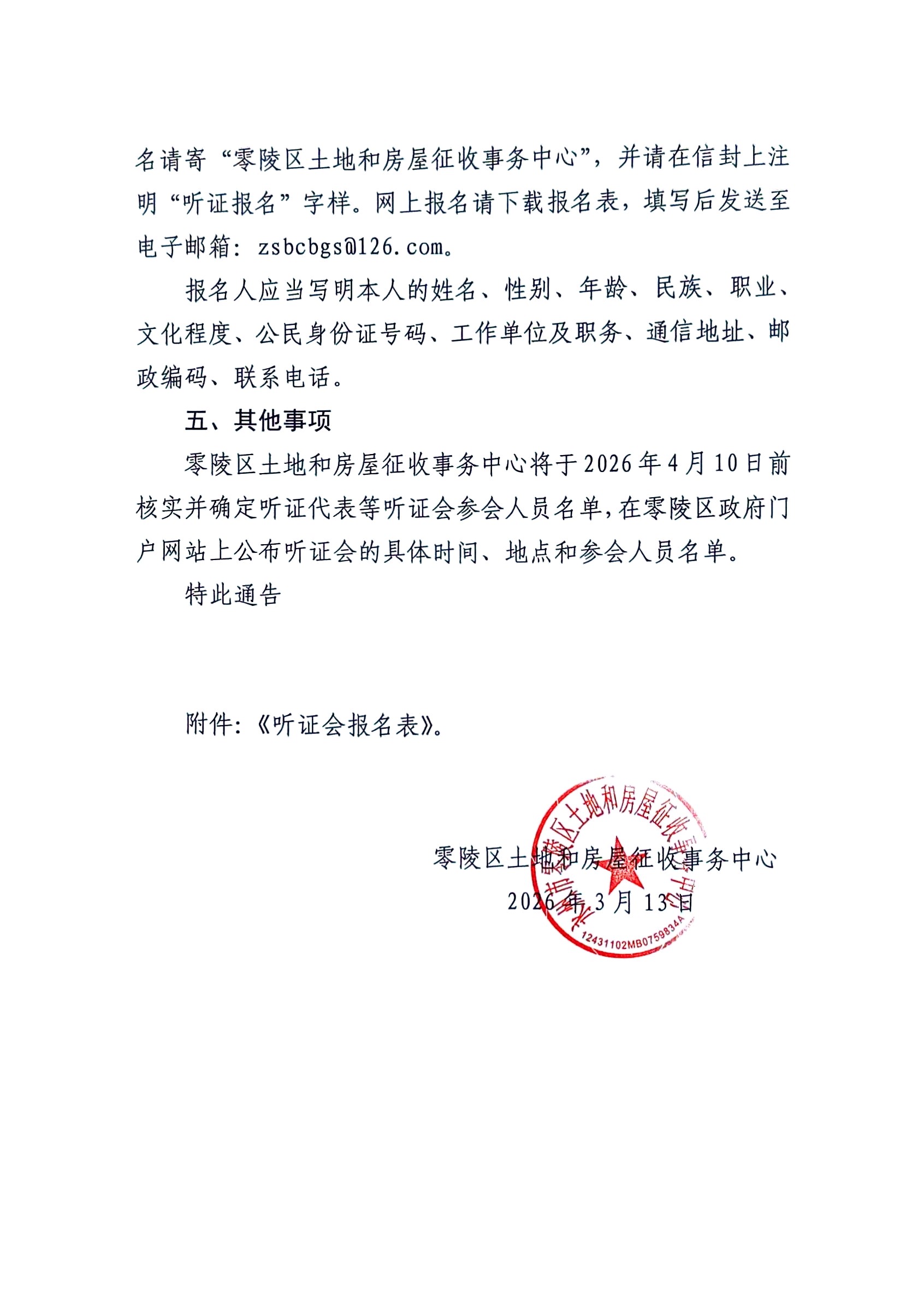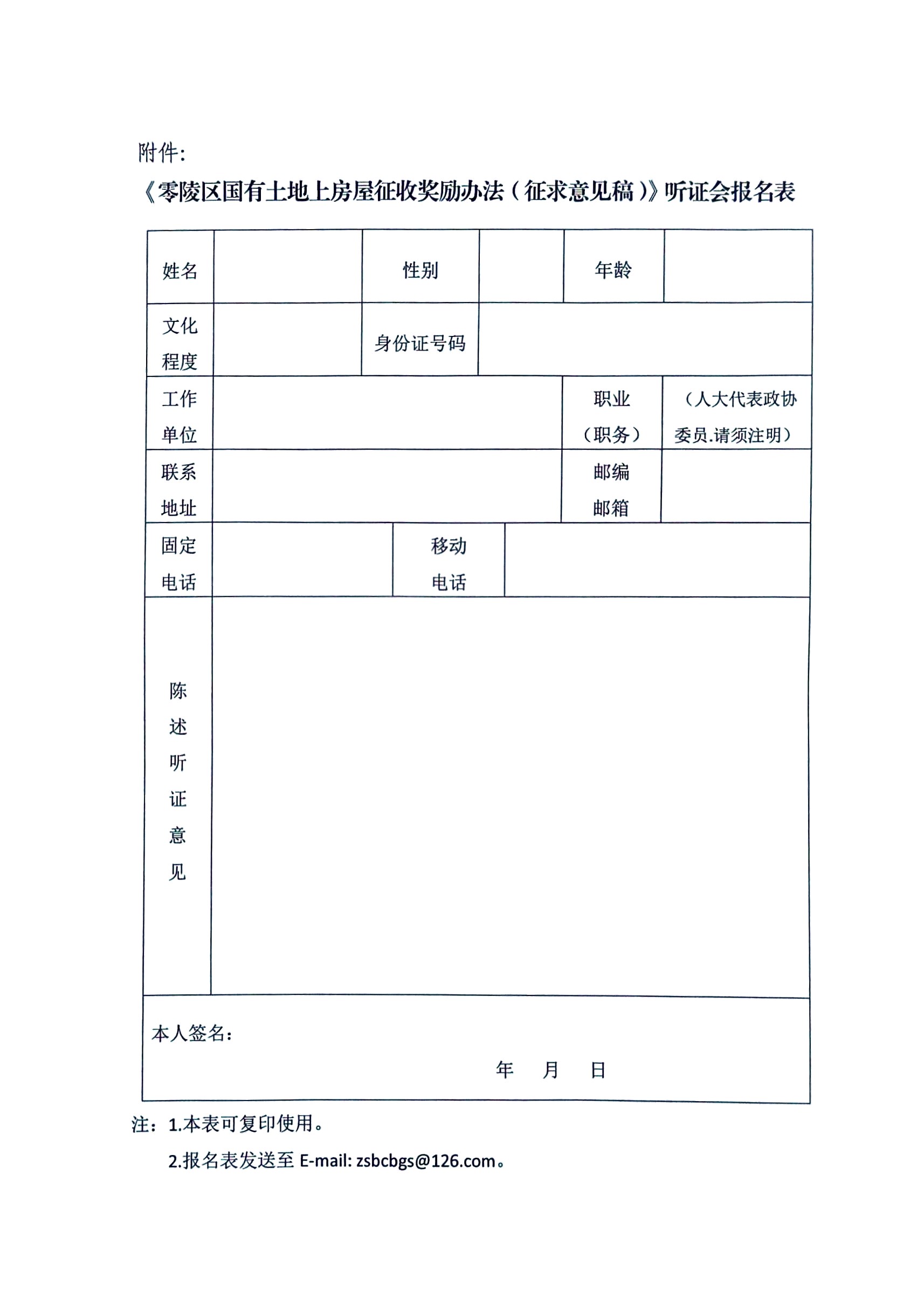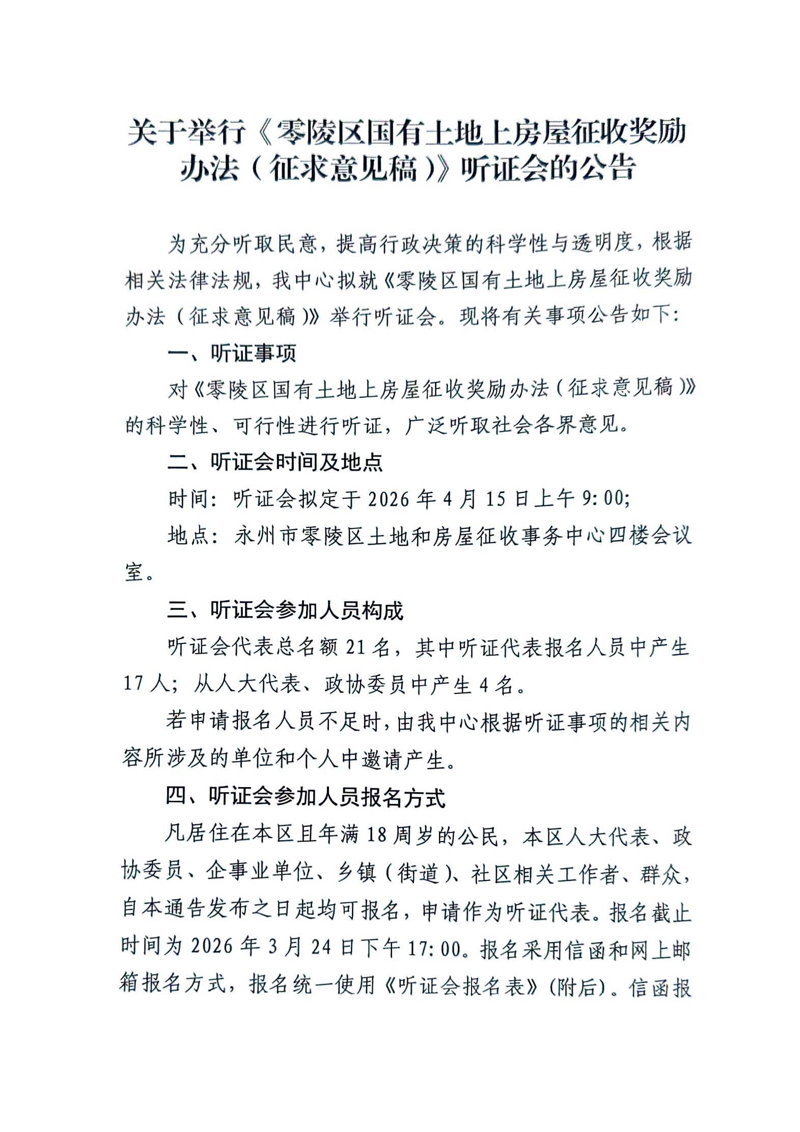 关于举行《零陵区国有土地上房屋征收奖励办法(征求意见稿)》听证会的公告