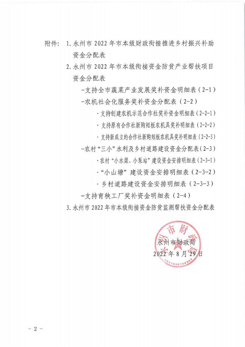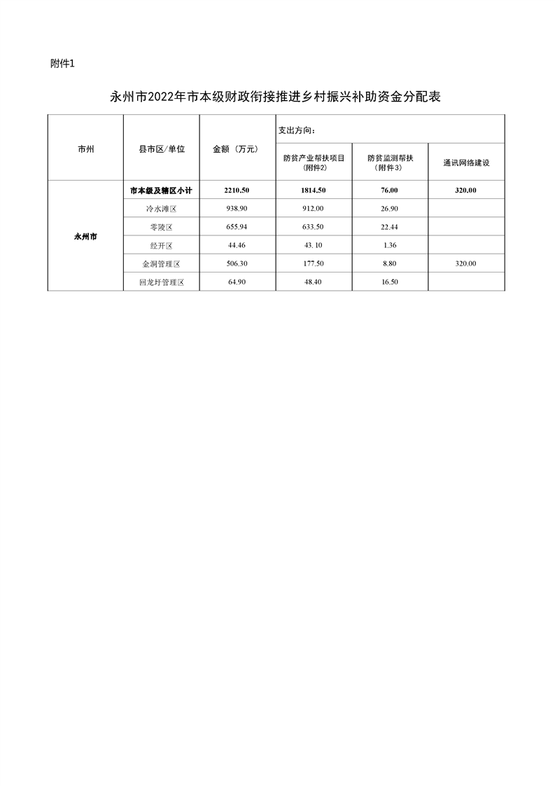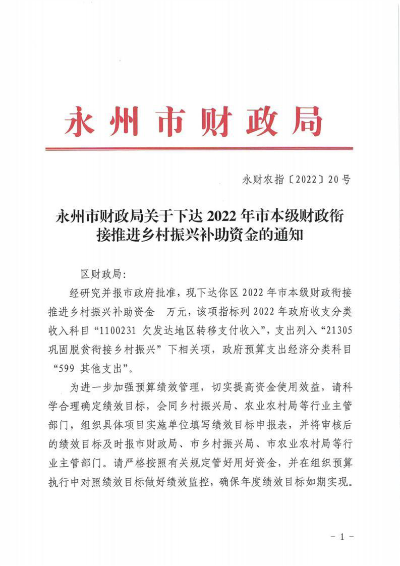 永州市财政局关于下达2022年市本级财政衔接推进乡村振兴补助资金的通知