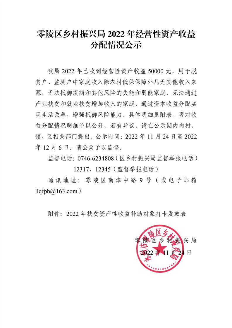零陵区乡村振兴局2022年经营性资产收益分配情况公示