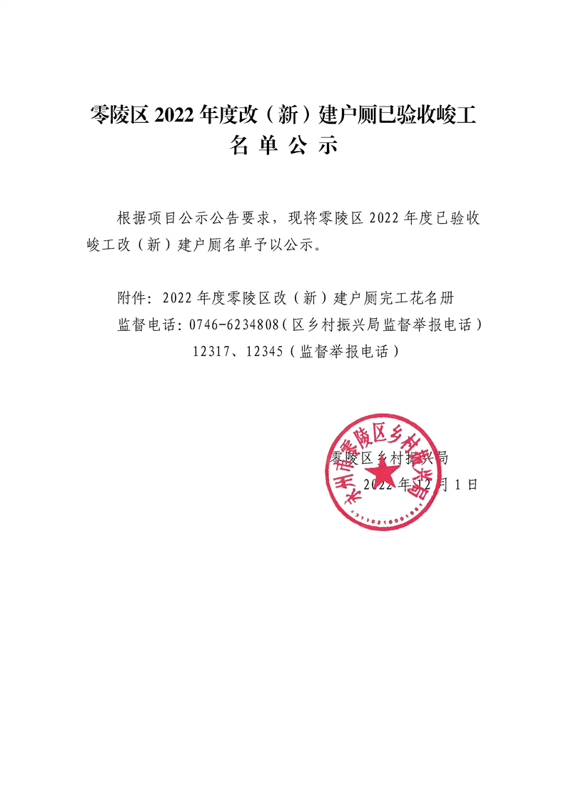2022年度零陵区改(新)建户厕已验收竣工名单公示