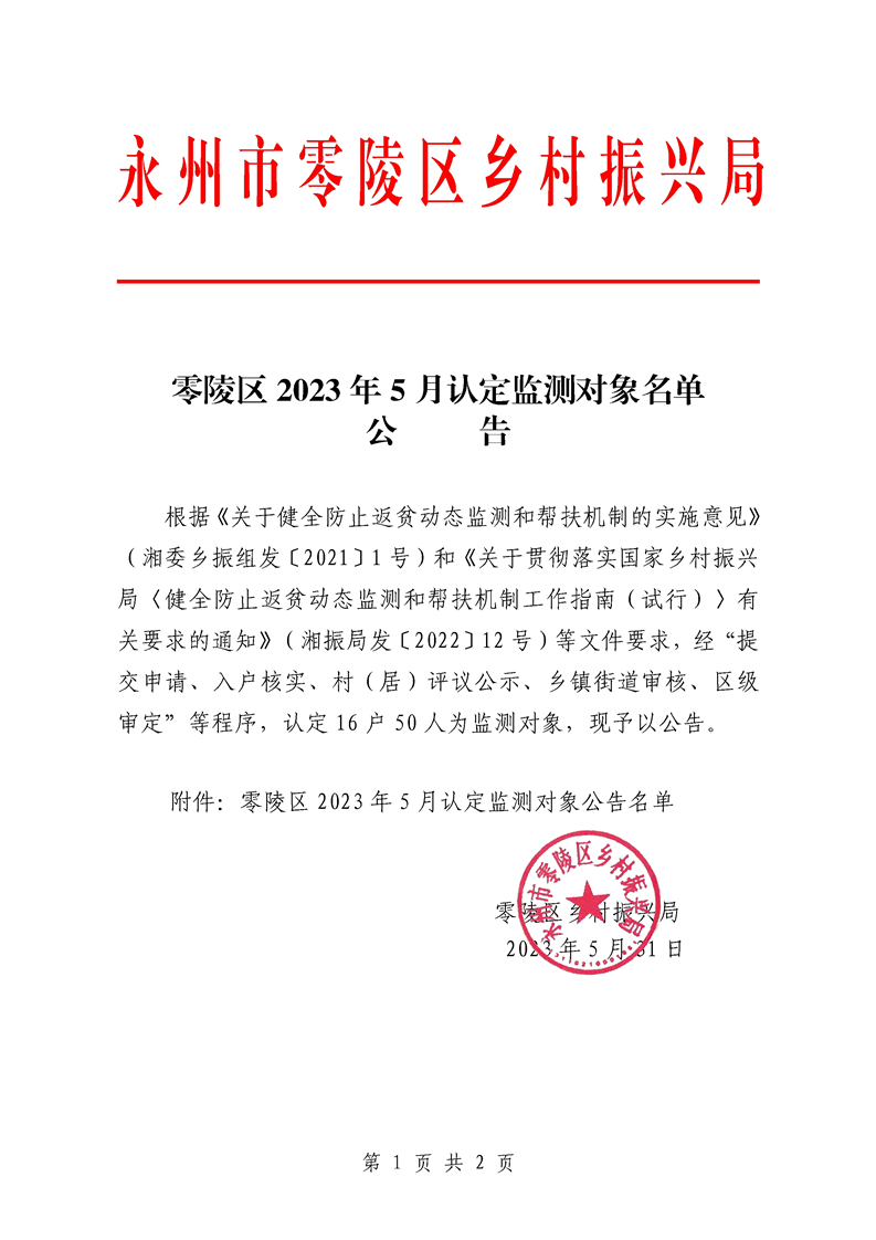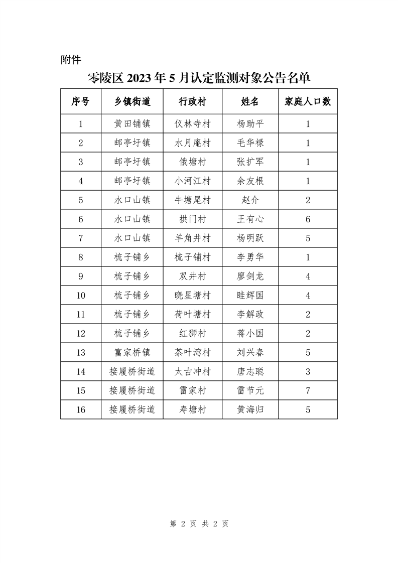零陵区2023年5月认定监测对象名单公告