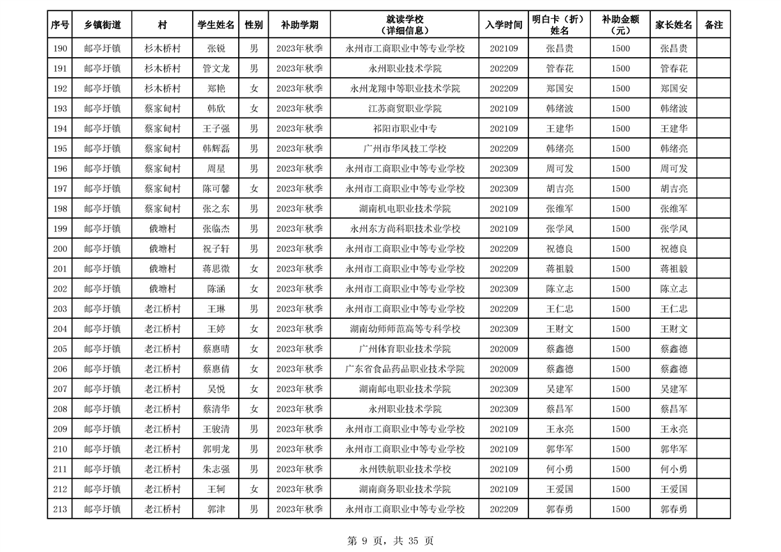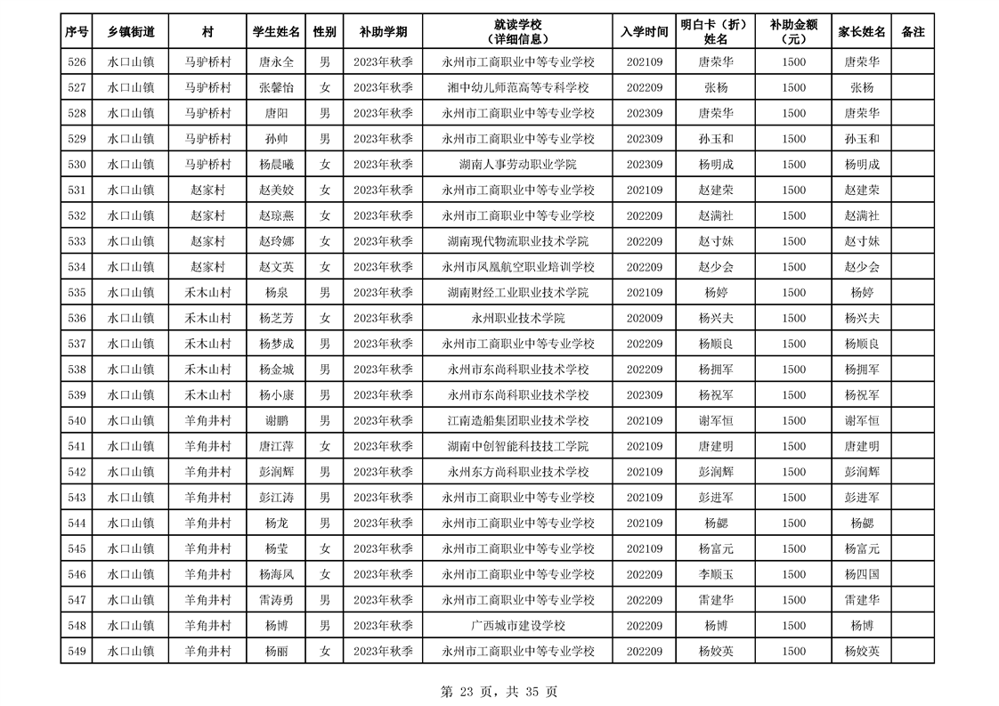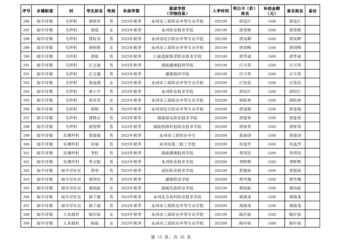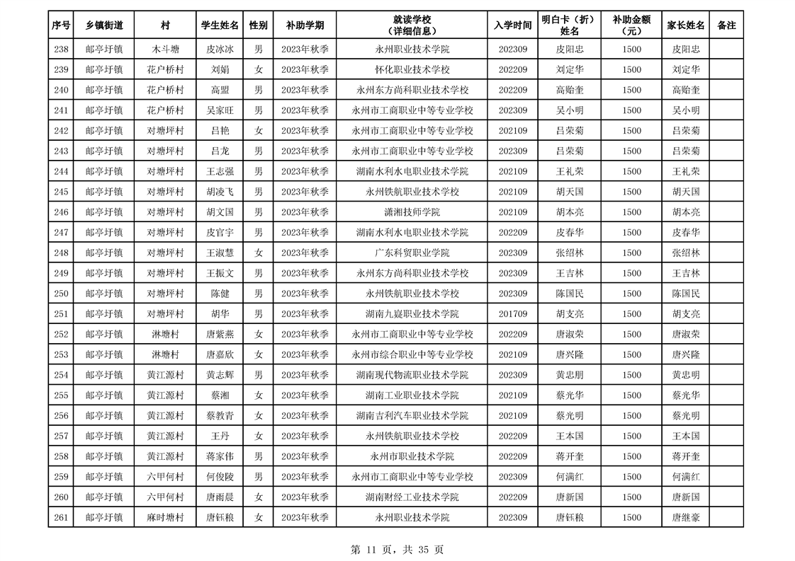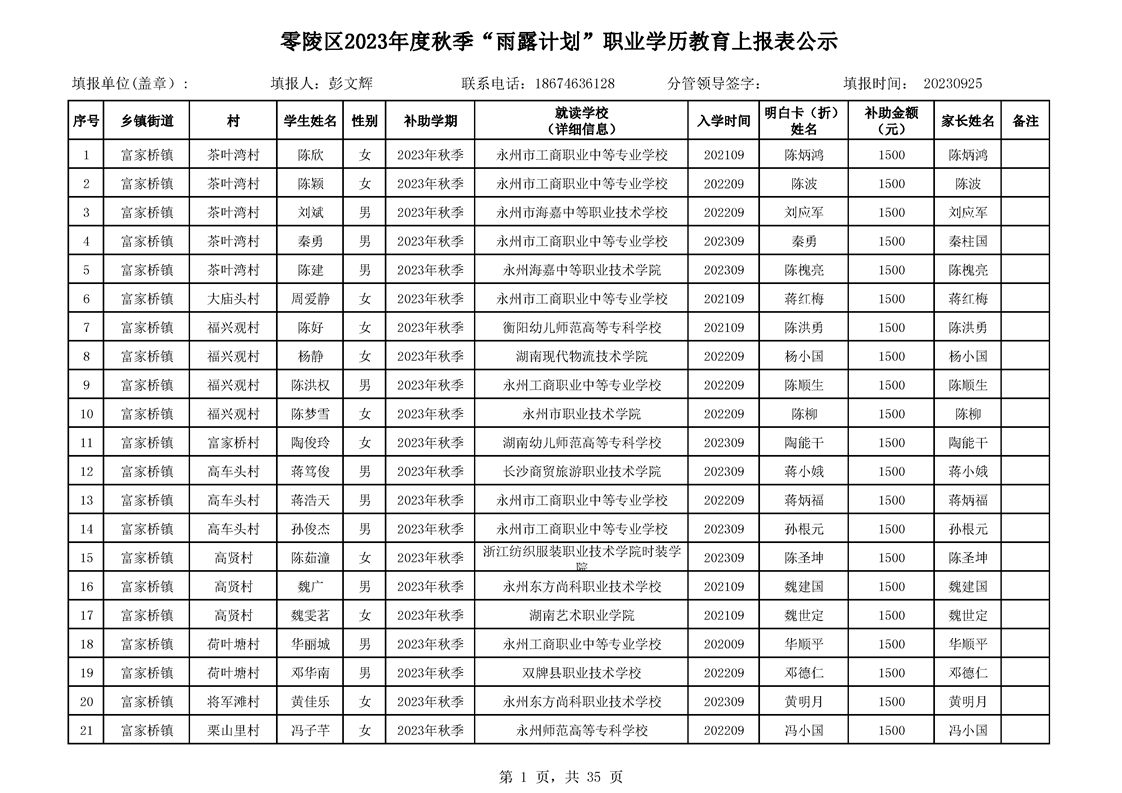 零陵区2023年度秋季“雨露计划”职业学历教育上报表公示