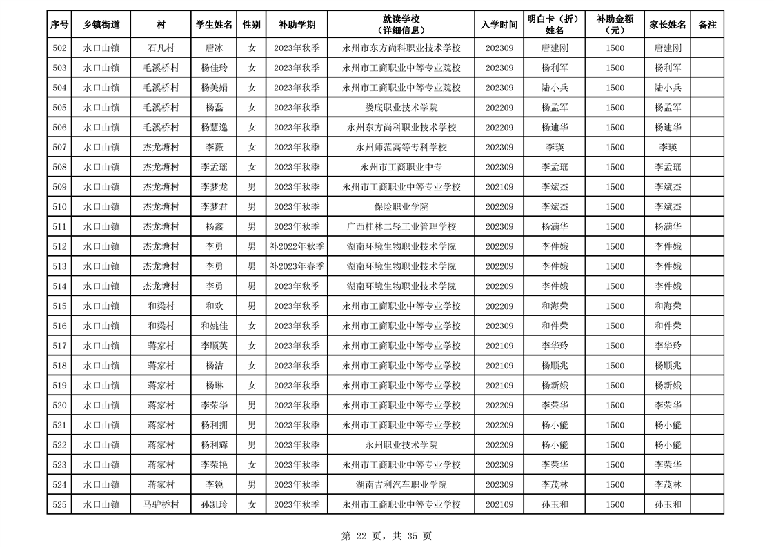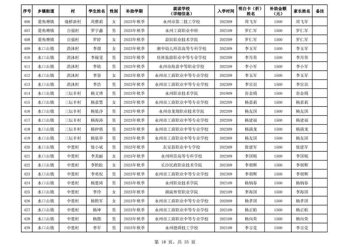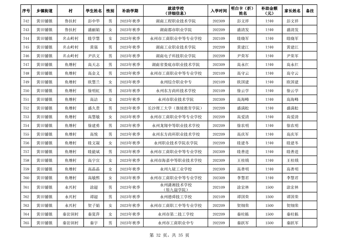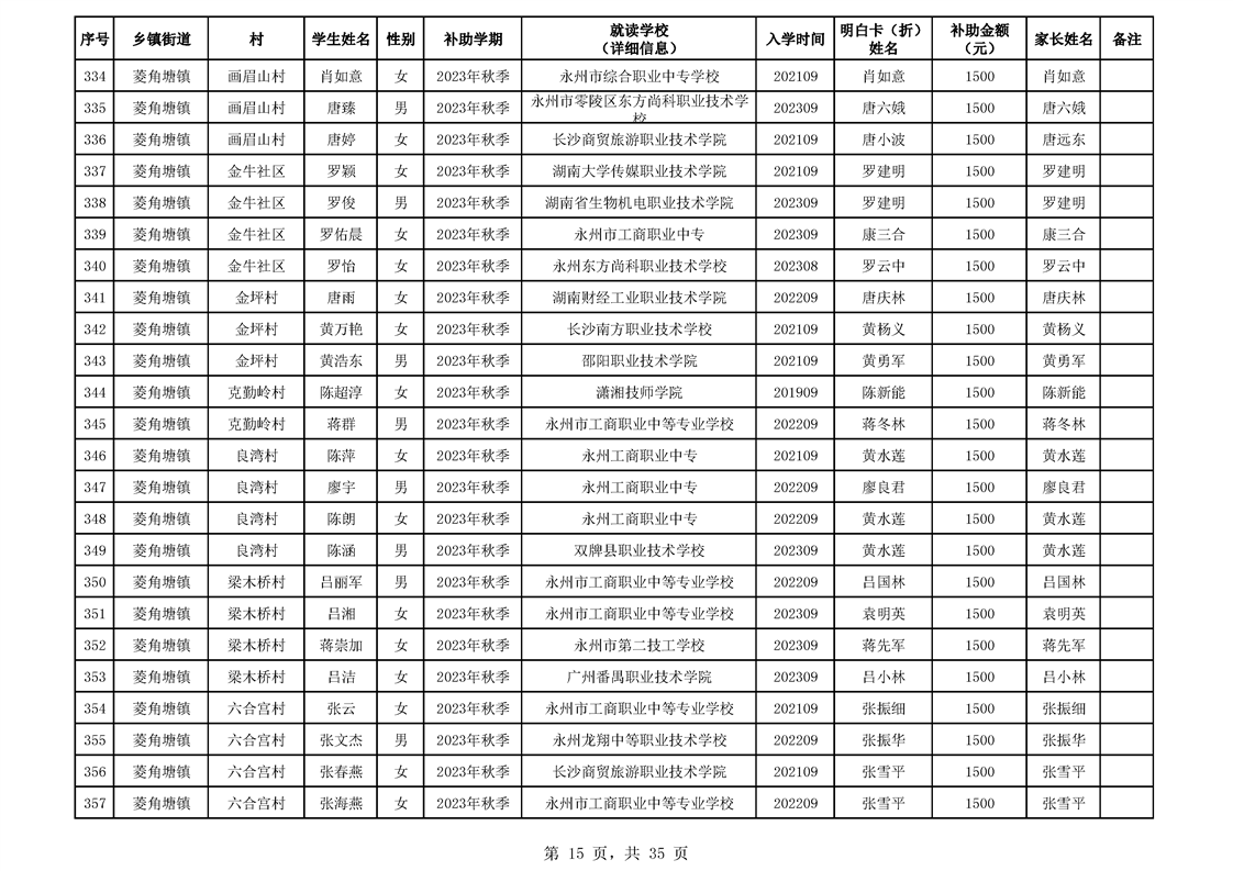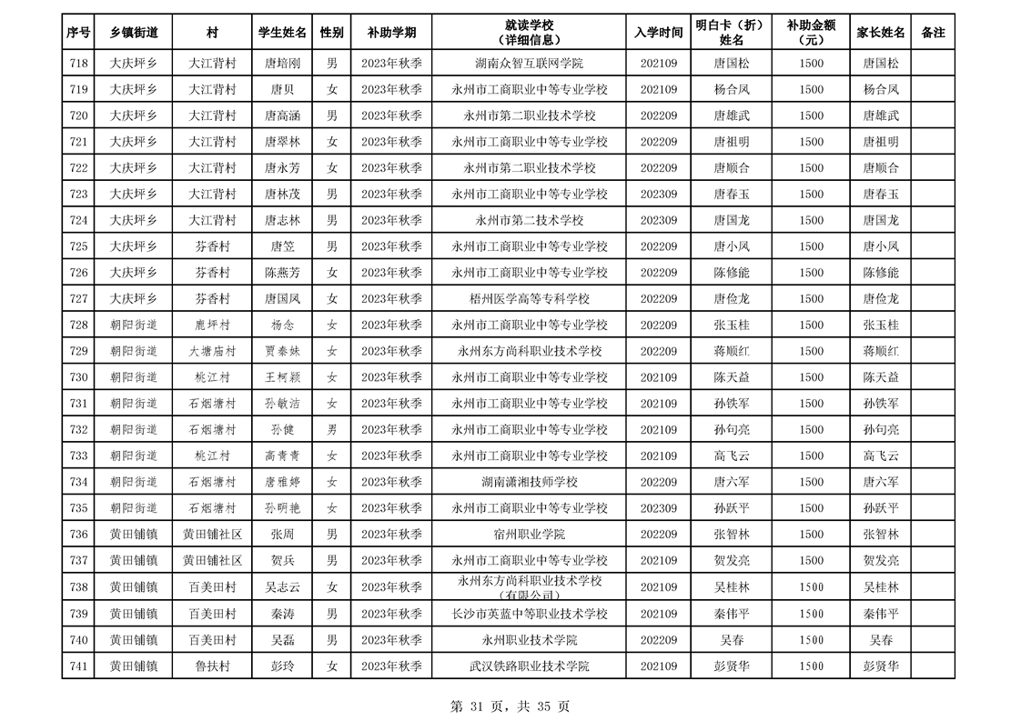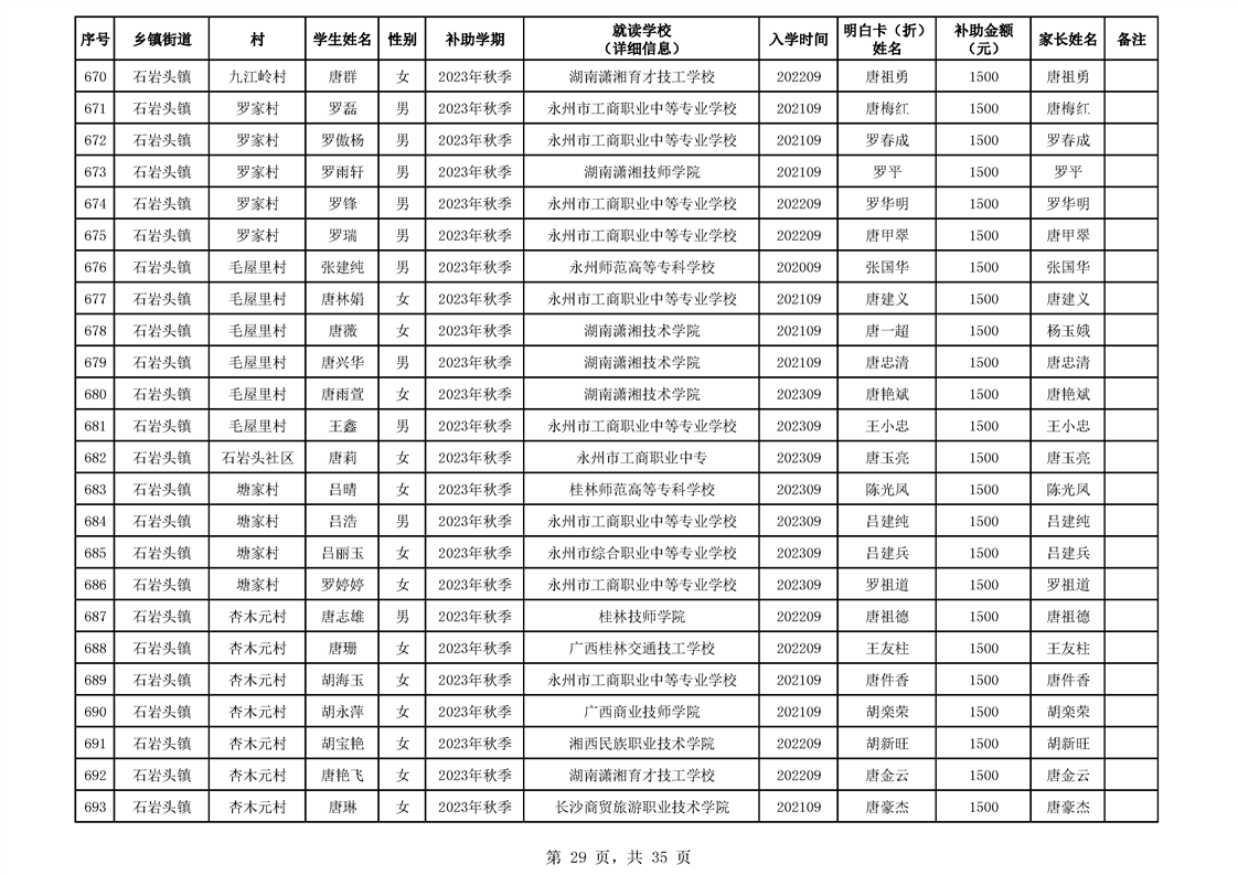 零陵区2023年度秋季“雨露计划”职业学历教育上报表公示