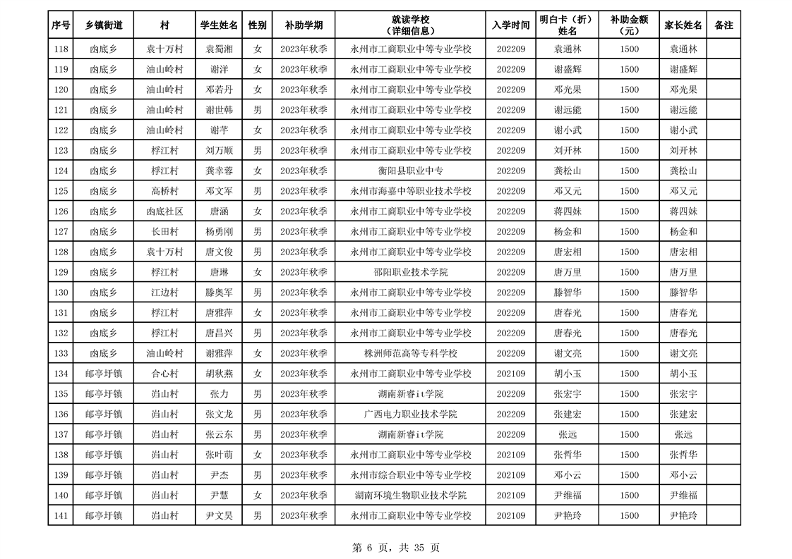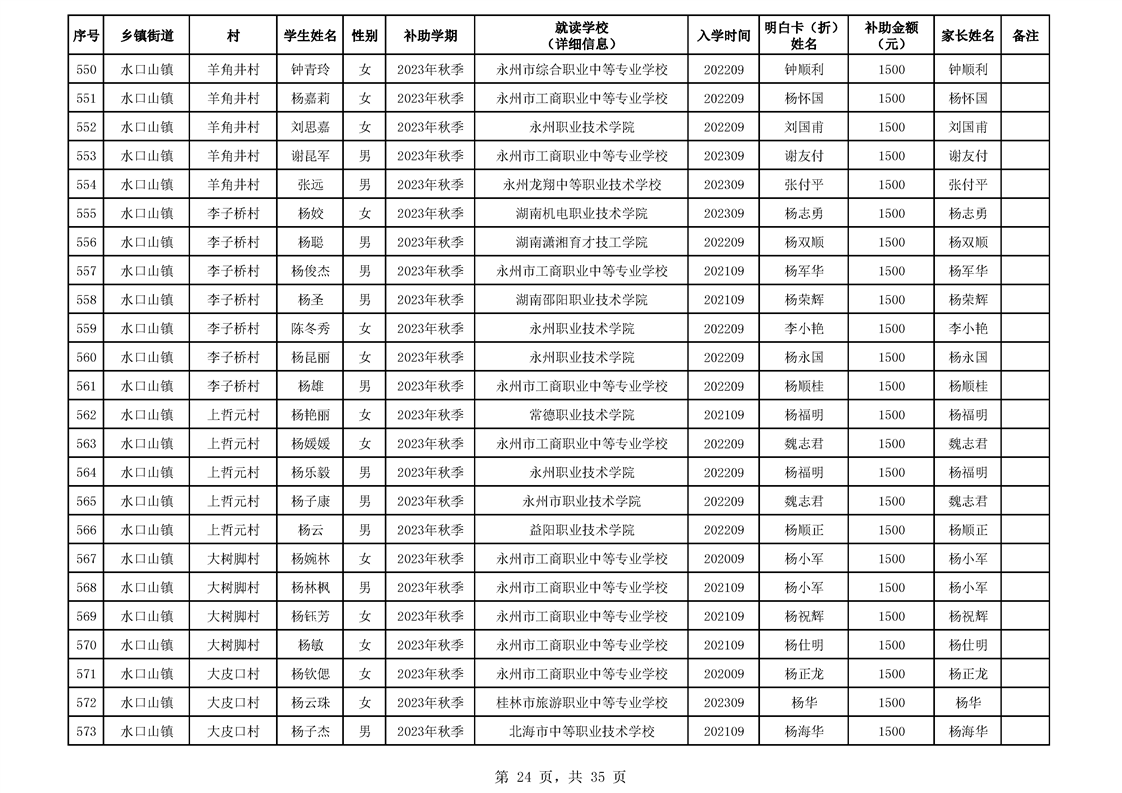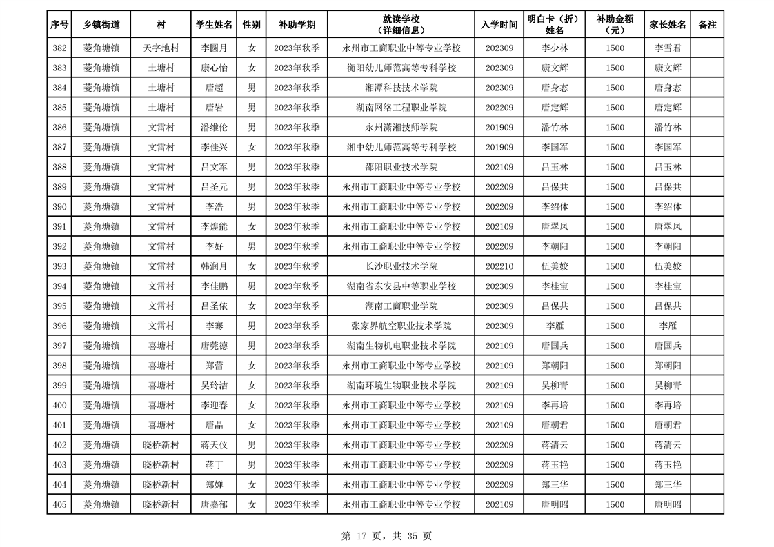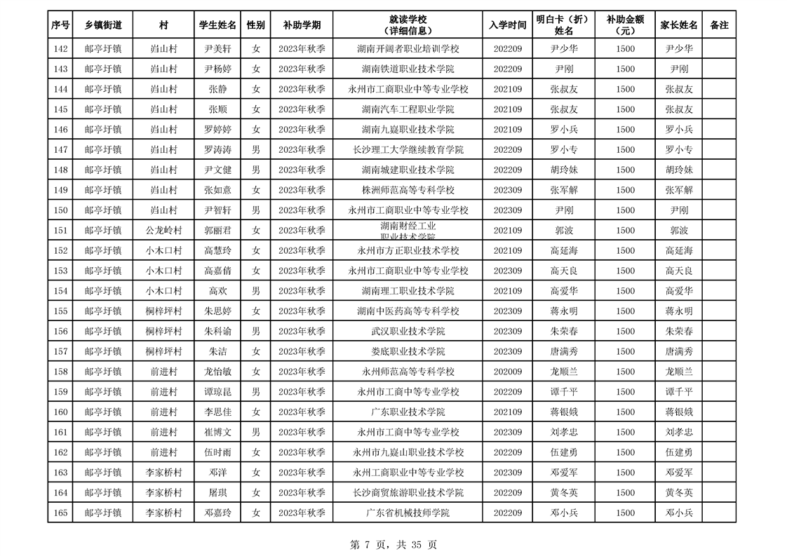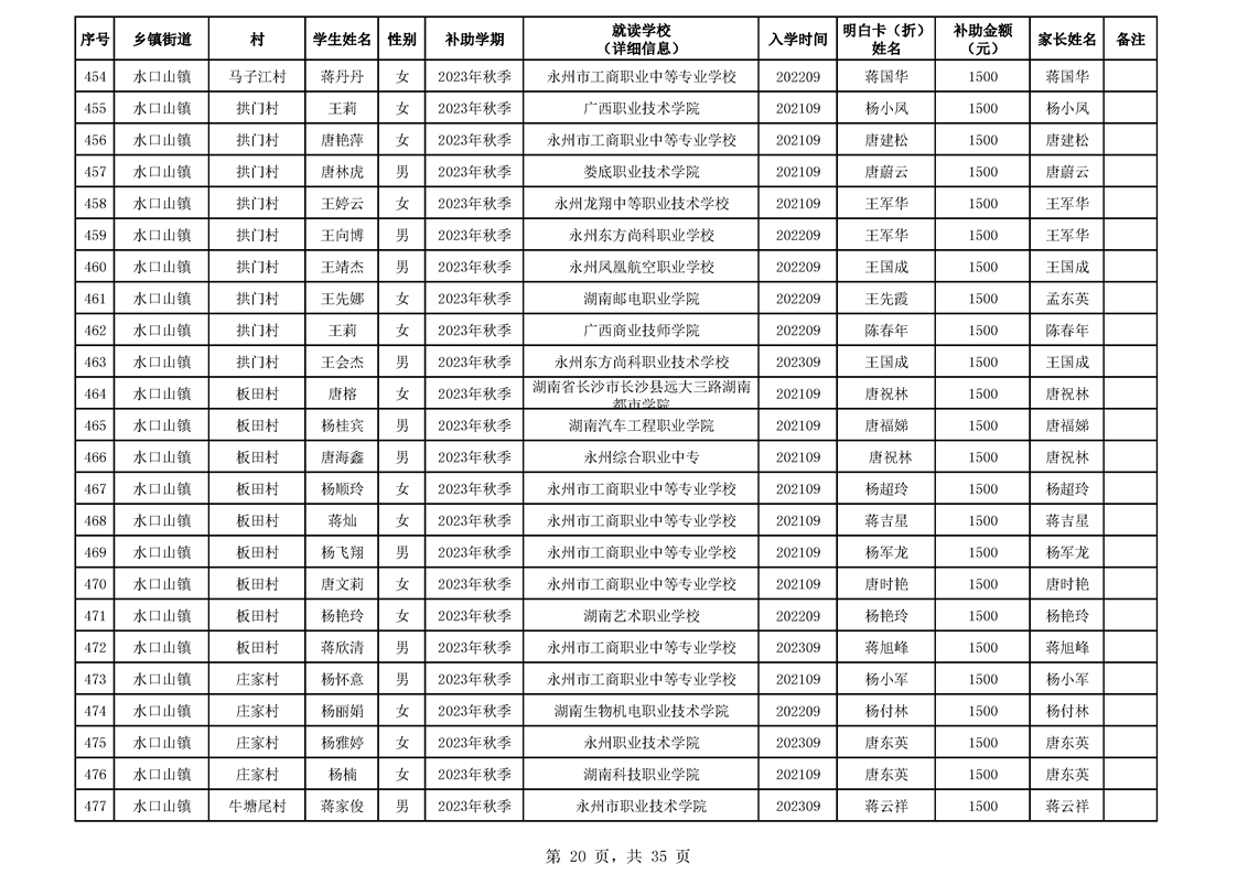 零陵区2023年度秋季“雨露计划”职业学历教育上报表公示