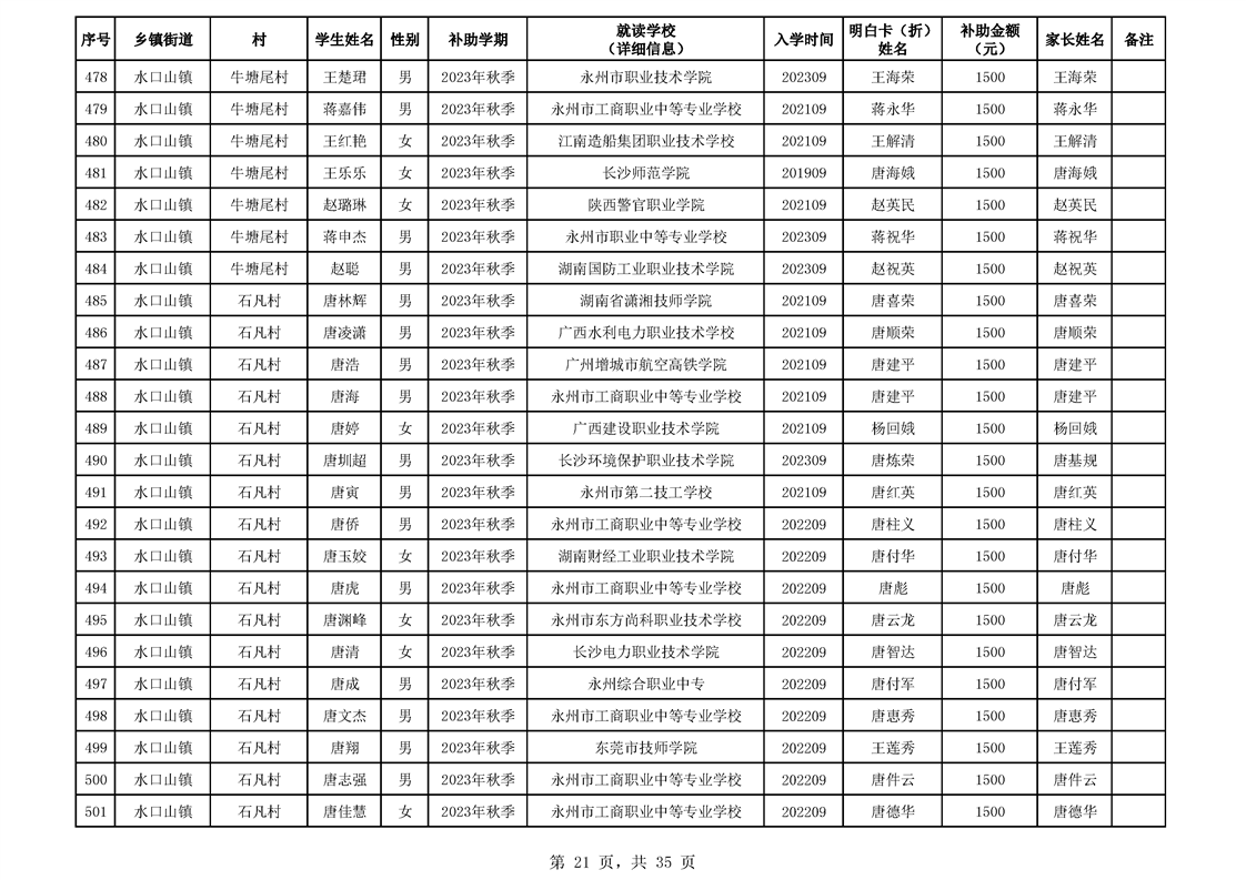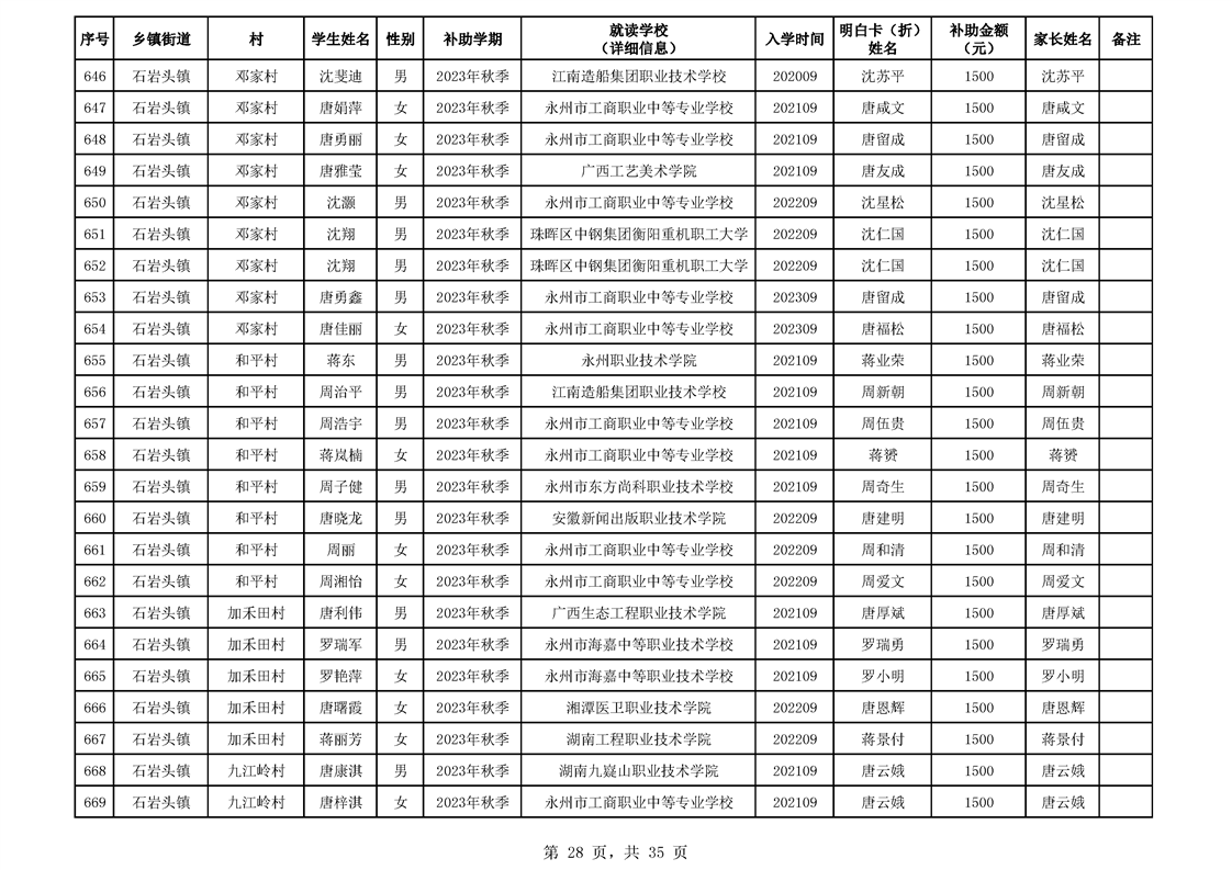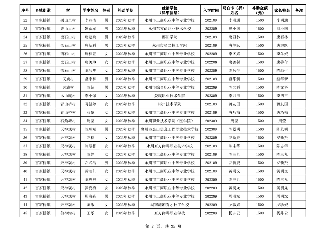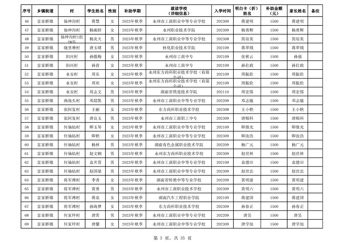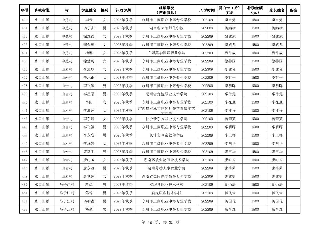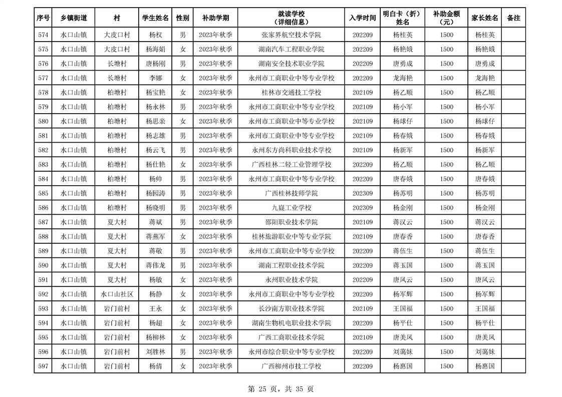 零陵区2023年度秋季“雨露计划”职业学历教育上报表公示