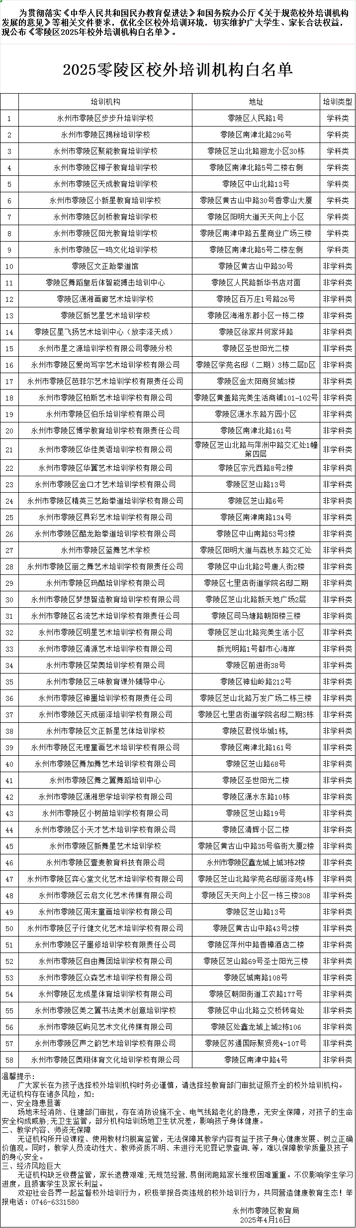 2025零陵区校外培训机构白名单