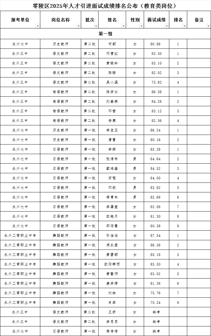 零陵区2025年人才引进面试成绩排名公布(教育类岗位)