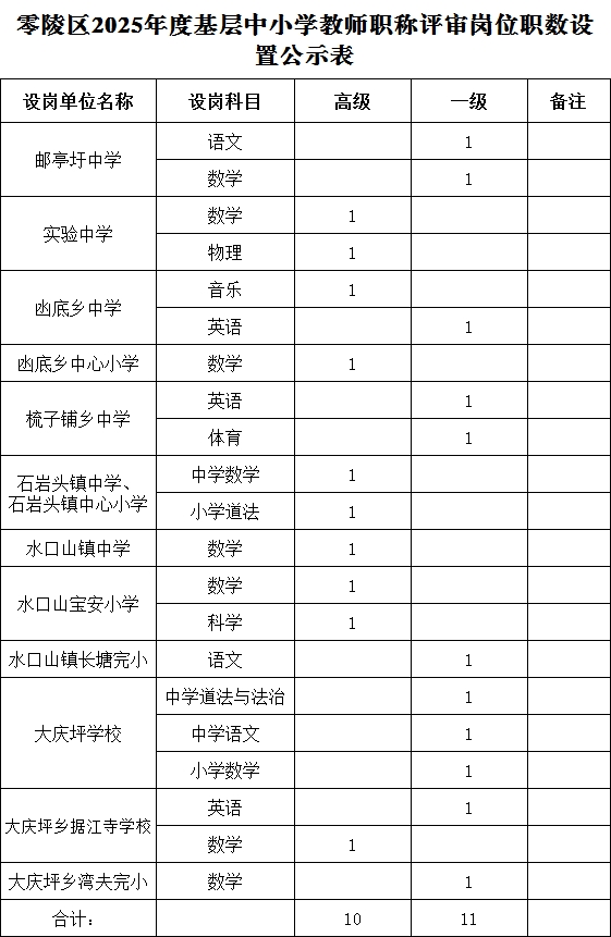 零陵区2025年度基层中小学教师职称评审岗位职数设置情况公示