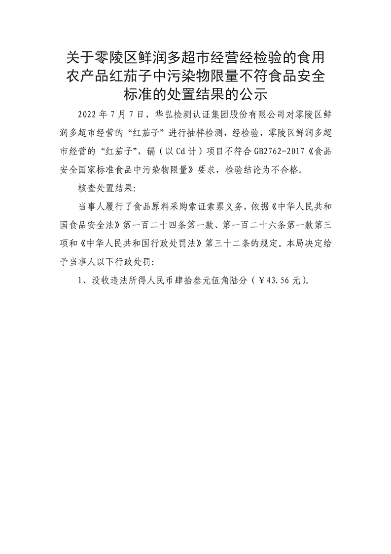 关于零陵区鲜润多超市经营经检验的食用农产品红茄子中污染物限量不符食品安全标准的处置结果的公示