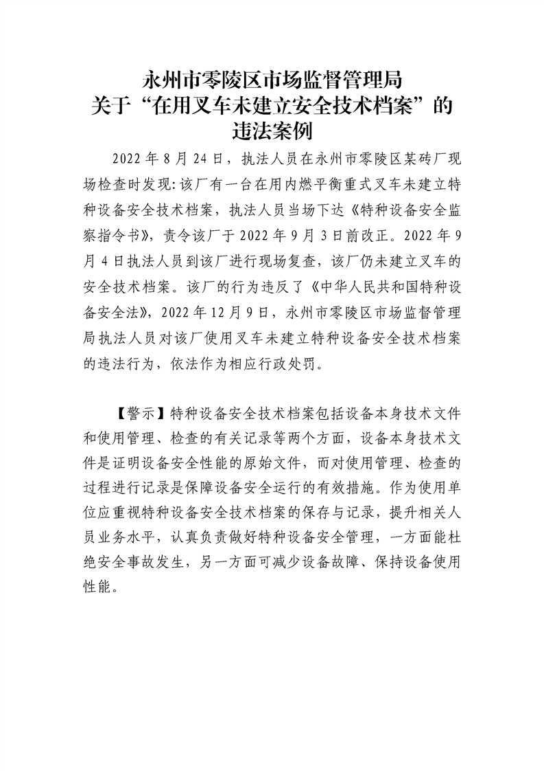 永州市零陵区市场监督管理局关于“在用叉车未建立安全技术档案”的违法案例(警示)