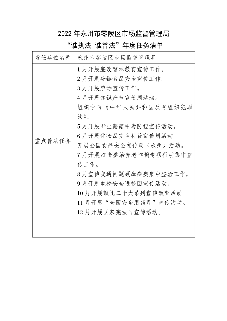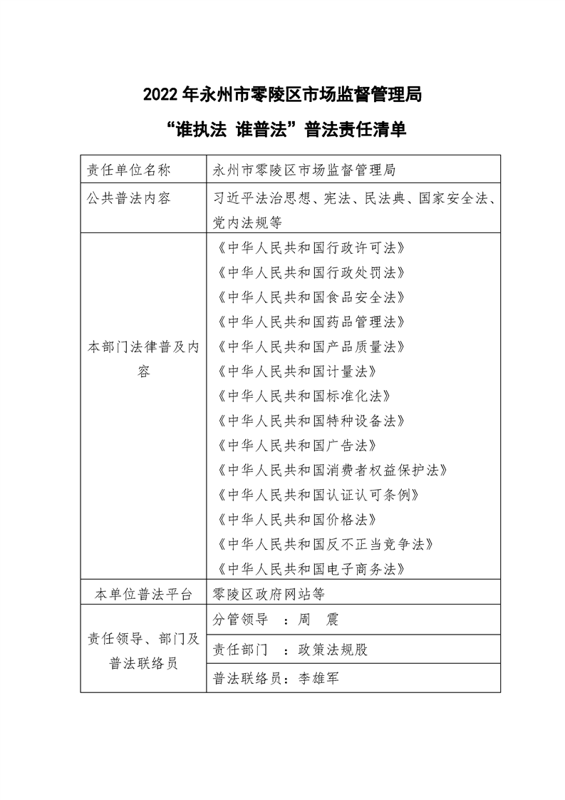 2022年永州市零陵区市场监督管理局“谁执法 谁普法”普法责任清单