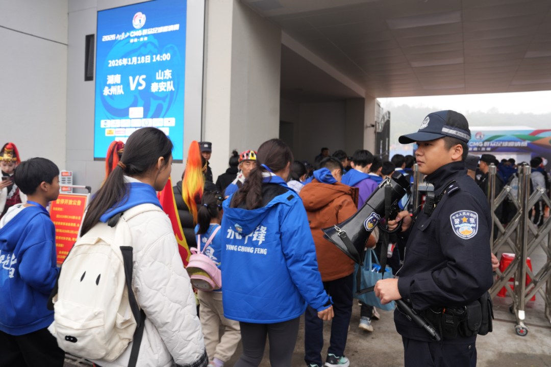 1月18日,由中央广播电视总台主办的2026CMG群众足球邀请赛在永州市体育场激情开赛。湖南永州队与山东泰安队为全国观众奉献了首场精彩对决,标志着这场为期7天、汇聚六省冠军的足球盛会正式启幕。球场内,球员拼抢、球迷呐喊,热情如火;球场外,永州公安的藏蓝身影全程守护、默默奉献,以最高标准、最实举措,确保了赛事安全、畅通、有序,让这场全国性的体育盛宴在冬日暖阳下平安绽放。