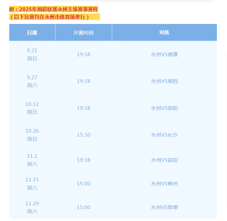 为更好地服务公众,满足广大球迷朋友的文化需求,配合2025年湖南省足球协会超级联赛(湘超联赛)举办,在永州赛区(主场)赛事当天,永州市博物馆将延长免费开放时间。