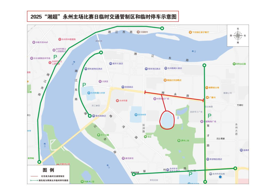 为确保2025年“湘超”永州赛区第四场比赛期间冷水滩中心城区道路交通安全、畅通、有序,根据《中华人民共和国道路交通安全法》规定,永州市公安局交通管理支队决定,在足球赛期间对赛事周边部分道路实行临时交通管制,现将有关事项公告如下: