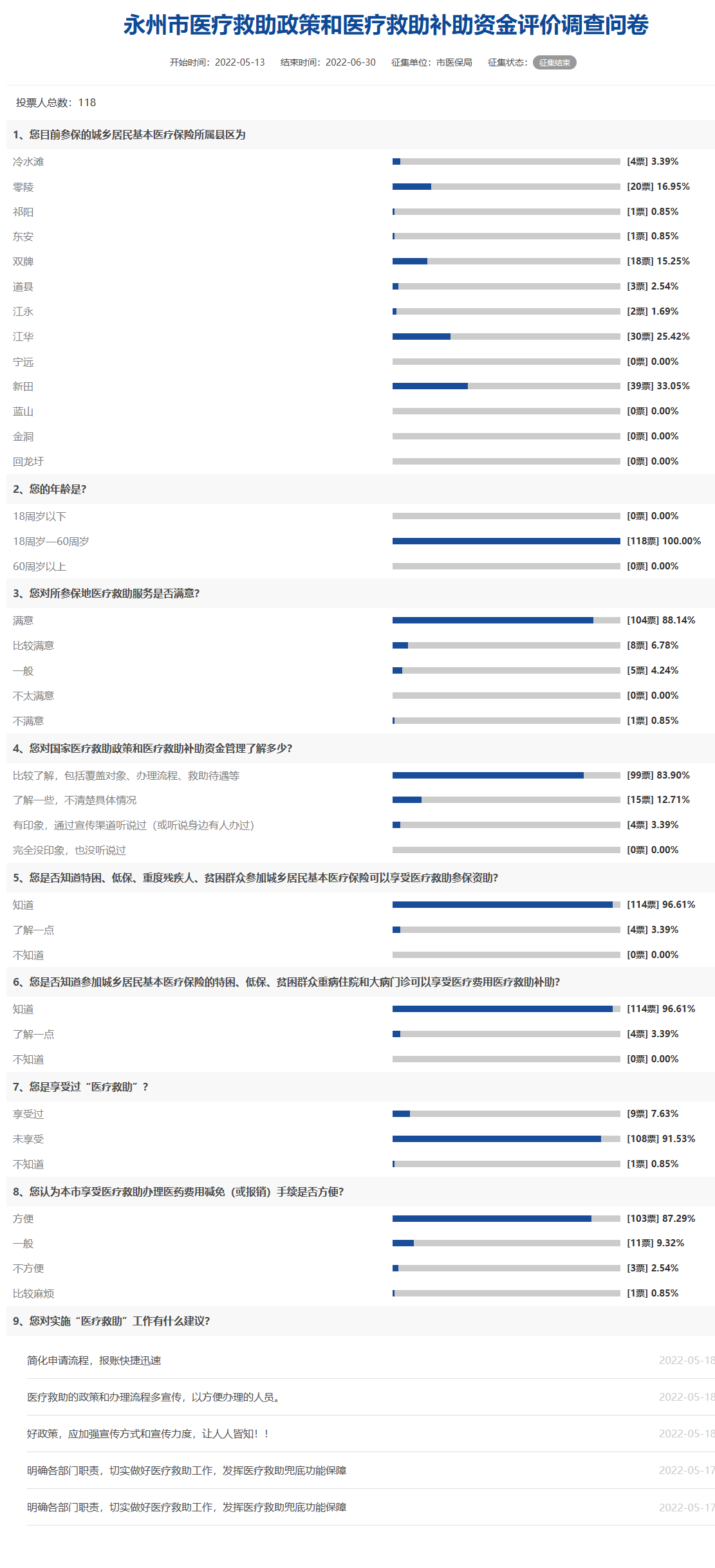 关于永州市医疗救助政策和医疗救助补助资金评价的调查问卷自2022年5月13日开始,至2022年6月30日结束,投票人数118人,具体情况见下图统计: