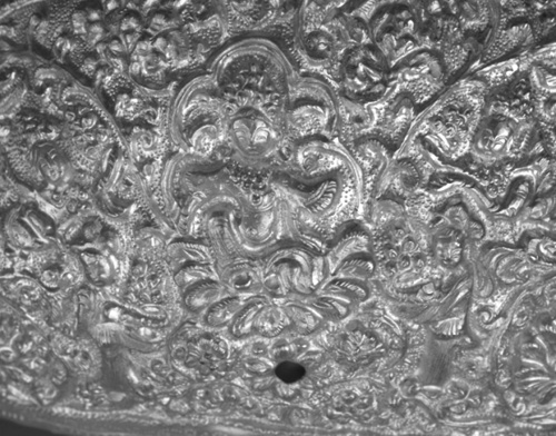 仔细欣赏这顶花冠的局部,我们可以看到,冠之前后部均饰有的那一佛像,面相饱满,体态丰腴,比例舒展匀称,结构合理,有血有肉,具有“环肥”的盛唐特色。就连两边那组捧物侍立的人物,也是面相饱满的,让人有一种梦回唐朝的感觉。